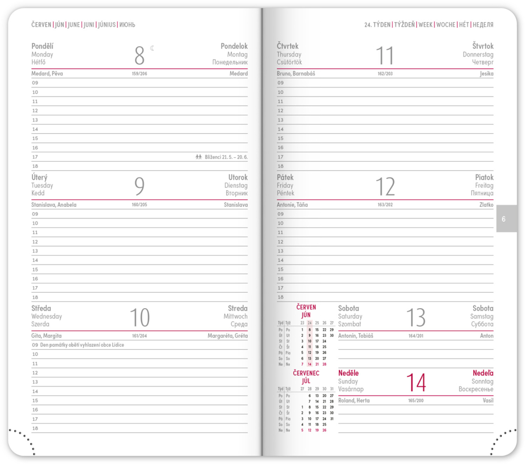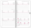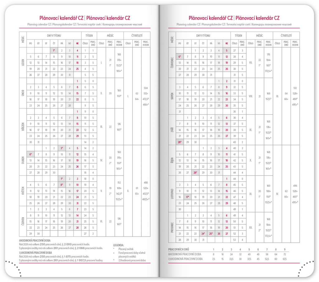 Kapesní diář Aprint 2026 v červené barvě. Kolekce vsadila na osvědčené barvy, které doplňuje nová ražba letopočtu. Týdenní rozvrh s česko-slovenským kalendáriem a doplňkovou angličtinou, němčinou, maďarštinou a ruštinou.