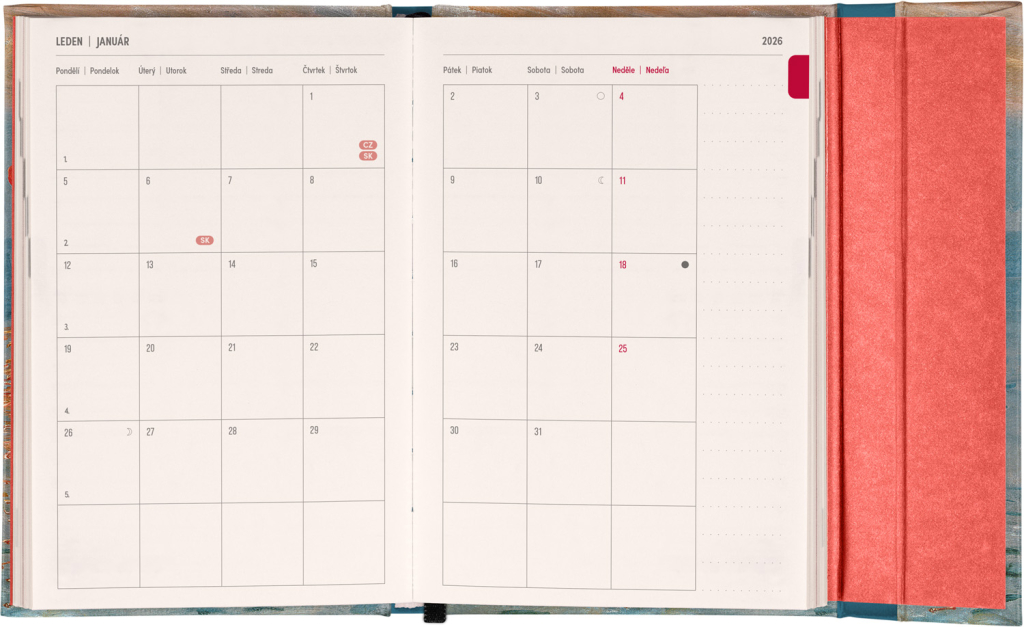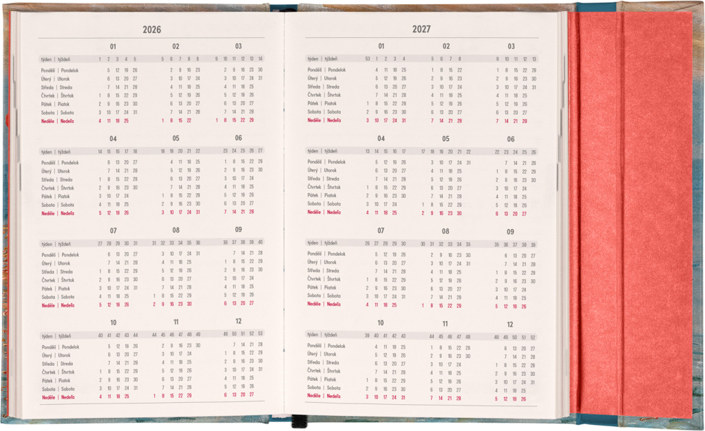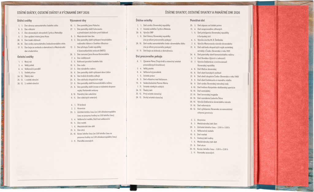 Týdenní diář s praktickým magnetickým uzavíráním je ideální volbou pro ty, kteří chtějí mít své plány přehledně pod kontrolou. Horizontální rozložení s českým a slovenským kalendáriem ve verzi týden na dvou stranách s prostorem pro poznámky. Součástí jsou praktické měsíční přehledy, ideální pro plánování dovolených či prázdnin, a také seznam českých a slovenských svátků a jmenin. V