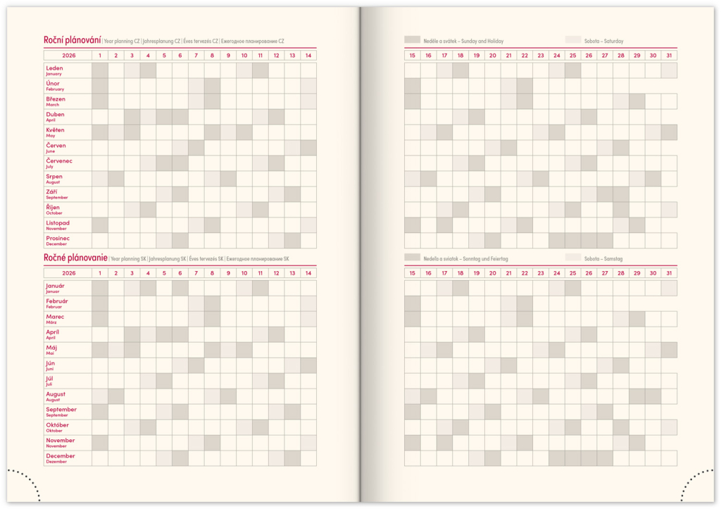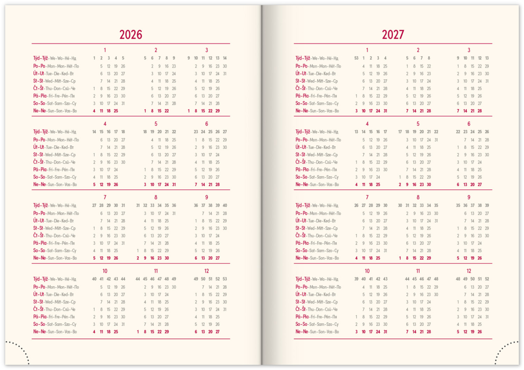 Nová, cenově dostupná řada diářů s obálkou z ekologického papíru spojuje styl a udržitelnost. Týdenní rozložení s česko-slovenským kalendáriem a doplňkovou angličtinou, němčinou, maďarštinou a ruštinou.