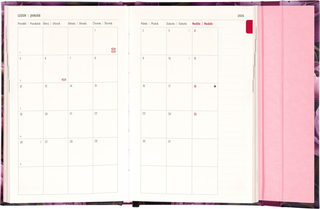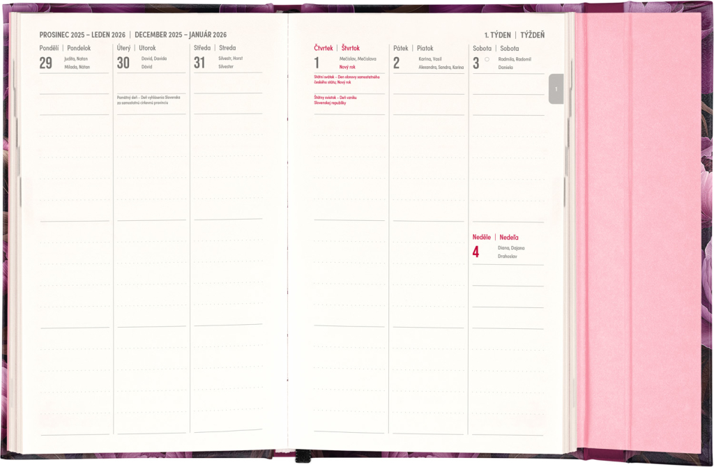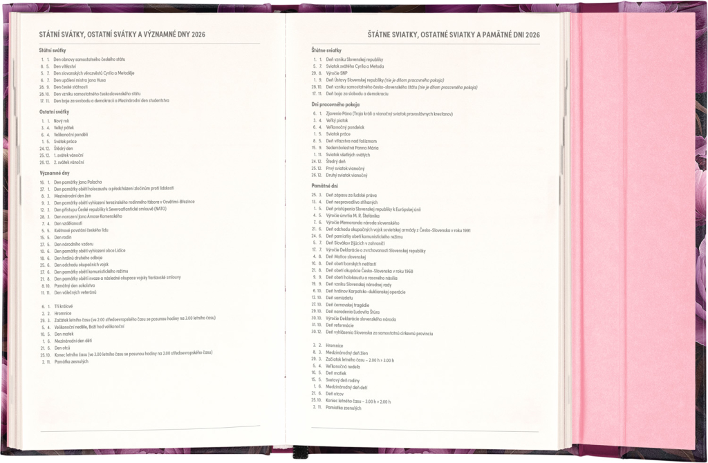 Týdenní diář s praktickým magnetickým uzavíráním je ideální volbou pro ty, kteří chtějí mít své plány přehledně pod kontrolou. Nabízí sloupcové rozvržení jednotlivých týdnů s dostatkem prostoru pro každodenní poznámky. Součástí jsou praktické měsíční přehledy, ideální pro plánování dovolených či prázdnin, a také seznam českých a slovenských svátků a jmenin. V