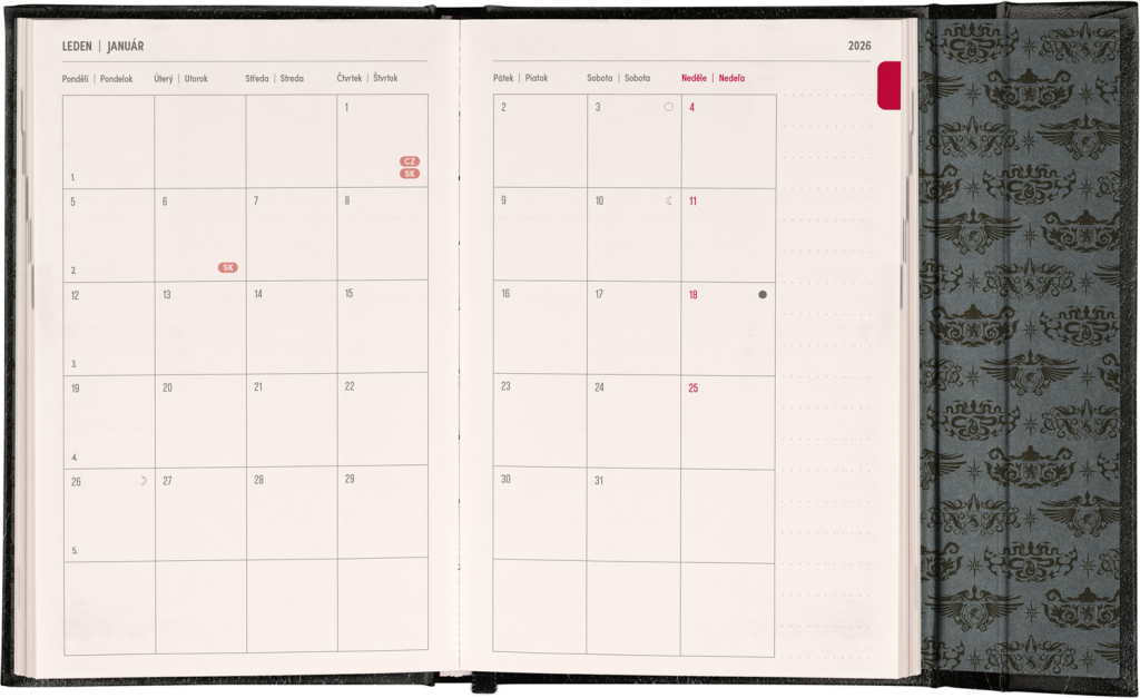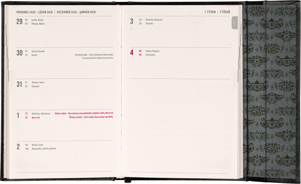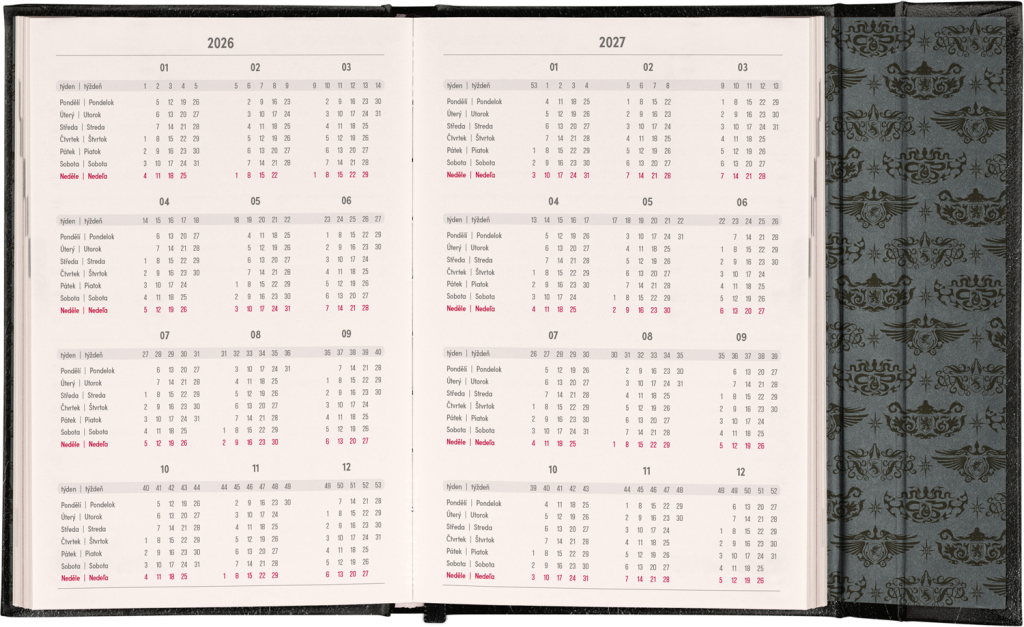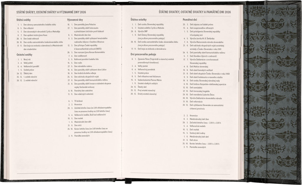 Týdenní diář s praktickým magnetickým uzavíráním je ideální volbou pro ty, kteří chtějí mít své plány přehledně pod kontrolou. Horizontální rozložení s českým a slovenským kalendáriem ve verzi týden na dvou stranách s prostorem pro poznámky. Součástí jsou praktické měsíční přehledy, ideální pro plánování dovolených či prázdnin, a také seznam českých a slovenských svátků a jmenin. V