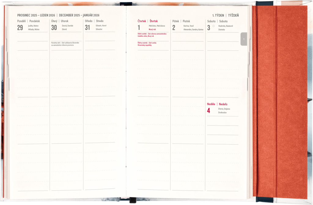 Týdenní diář s praktickým magnetickým uzavíráním je ideální volbou pro ty, kteří chtějí mít své plány přehledně pod kontrolou. Nabízí sloupcové rozvržení jednotlivých týdnů s dostatkem prostoru pro každodenní poznámky. Součástí jsou praktické měsíční přehledy, ideální pro plánování dovolených či prázdnin, a také seznam českých a slovenských svátků a jmenin. V