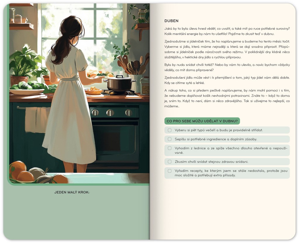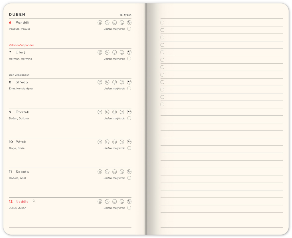 Laskavý diář vás provede rokem plným zjednodušování – každý měsíc se zaměřuje na jednu oblast, ve které si můžeme život zlehčit a tolik nezahlcovat zbytečnostmi. Přináší praktické tipy, inspiraci i jemné pobídky k uvolnění a nalezení radosti v běžných věcech, které jsou ve skutečnosti mnohem významnější, než se zdají. Vypuštěním zbytečností, nejen těch materiálních, vytváříme prostor pro to, co je pro nás opravdu důležité. Diář má horizontální rozložení s českým kalendáriem a prostorem pro poznámky. Součástí je i praktický měsíční přehled, ideální pro plánování dovolených či prázdnin.
