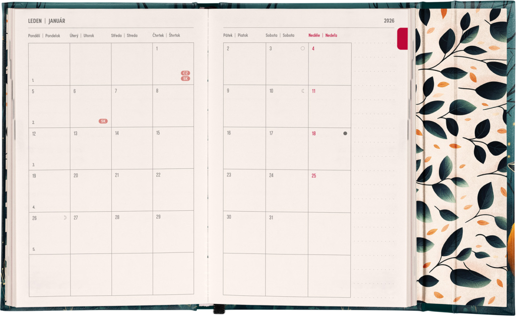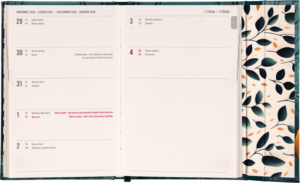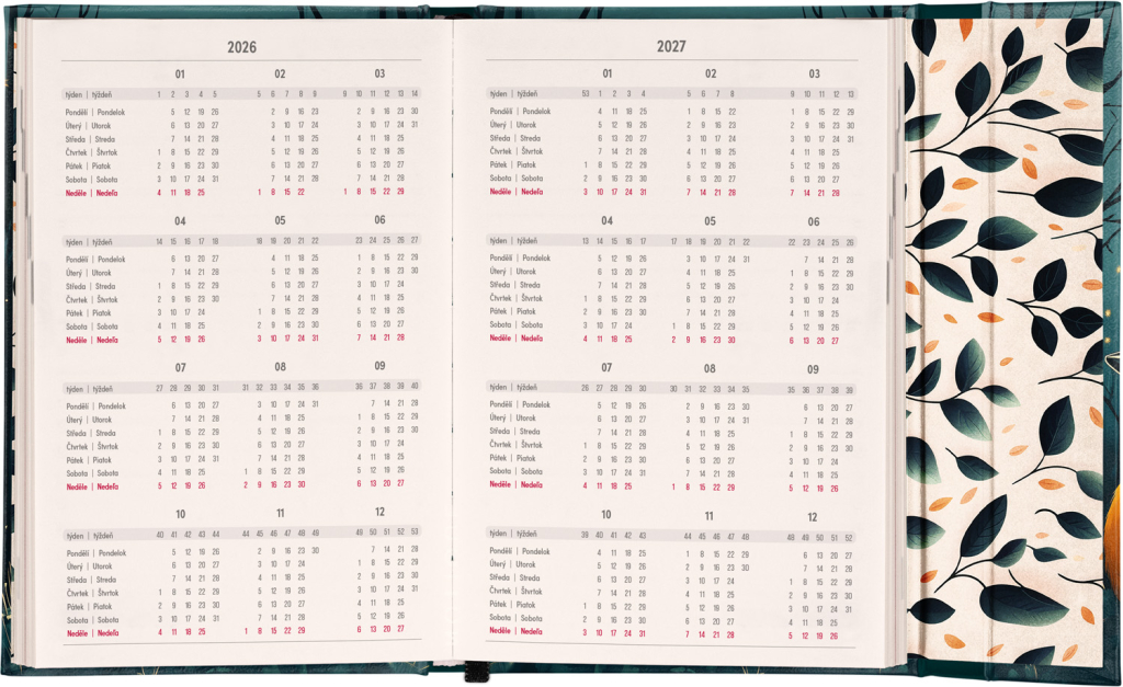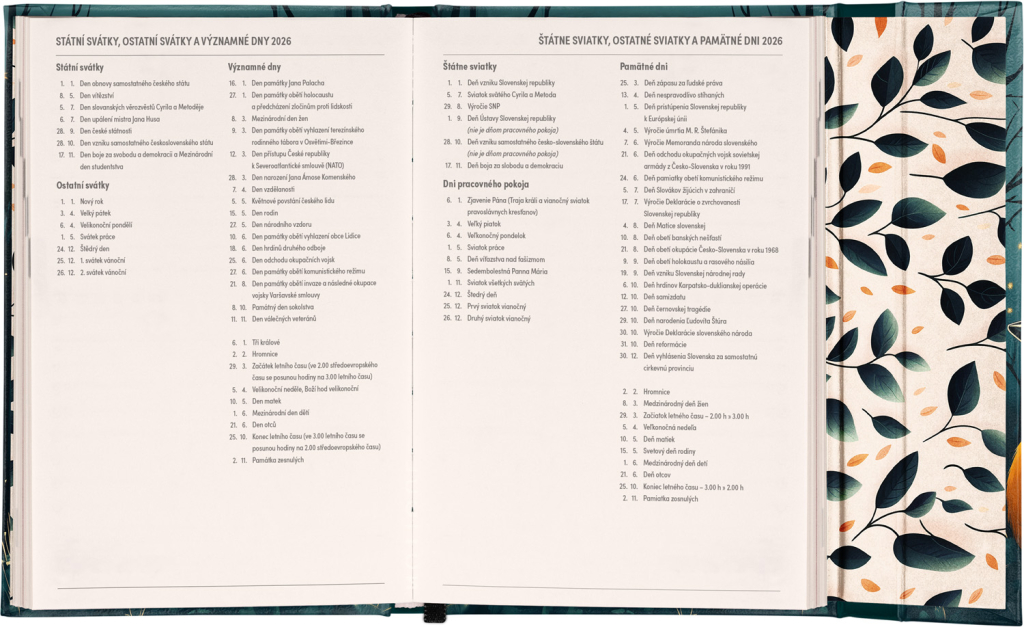 Týdenní diář s praktickým magnetickým uzavíráním je ideální volbou pro ty, kteří chtějí mít své plány přehledně pod kontrolou. Horizontální rozložení s českým a slovenským kalendáriem ve verzi týden na dvou stranách s prostorem pro poznámky. Součástí jsou praktické měsíční přehledy, ideální pro plánování dovolených či prázdnin, a také seznam českých a slovenských svátků a jmenin. V