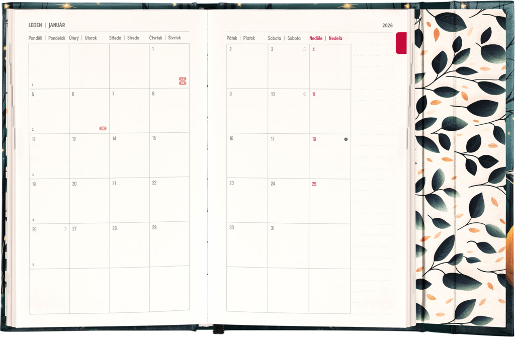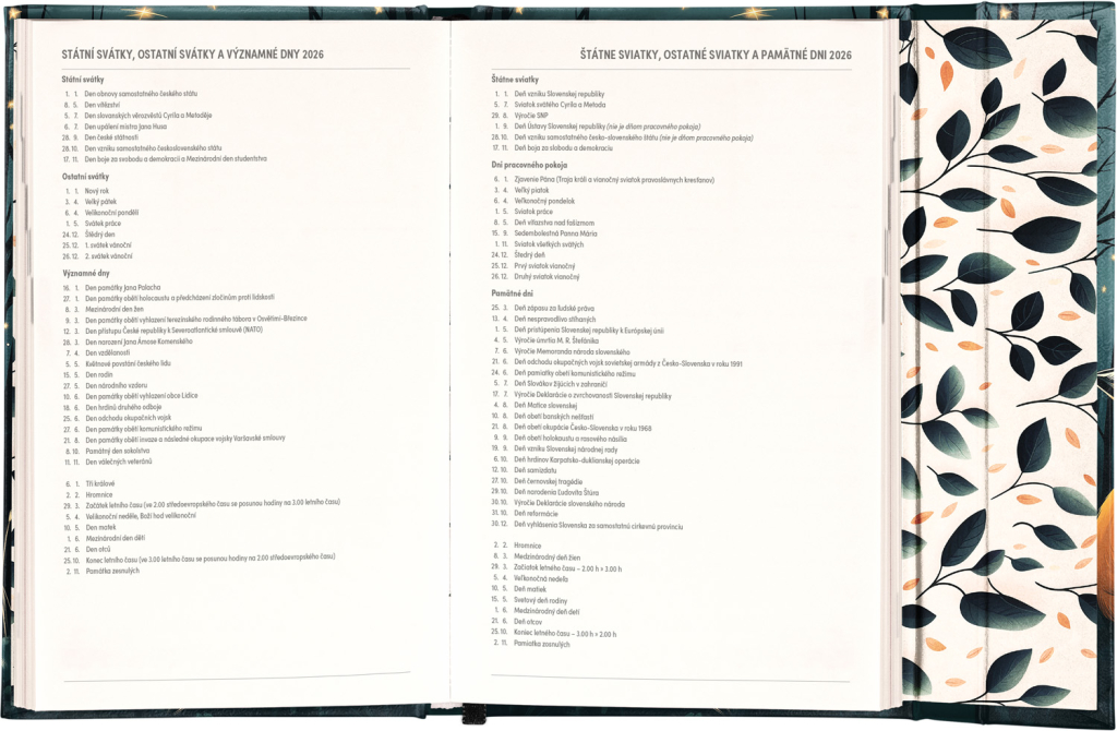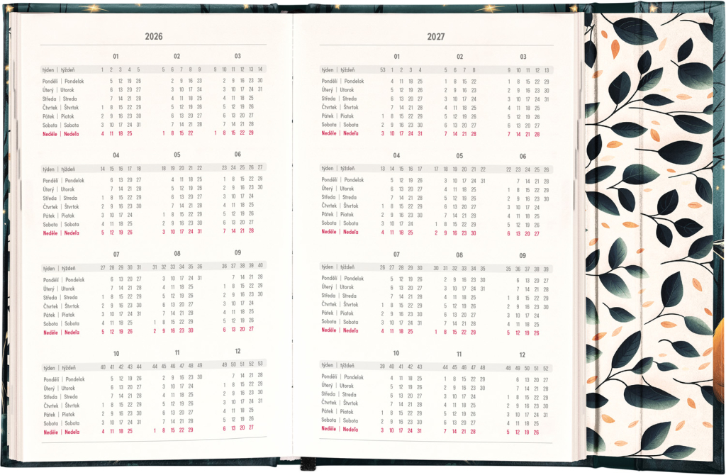 Týdenní diář s praktickým magnetickým uzavíráním je ideální volbou pro ty, kteří chtějí mít své plány přehledně pod kontrolou. Nabízí sloupcové rozvržení jednotlivých týdnů s dostatkem prostoru pro každodenní poznámky. Součástí jsou praktické měsíční přehledy, ideální pro plánování dovolených či prázdnin, a také seznam českých a slovenských svátků a jmenin. V