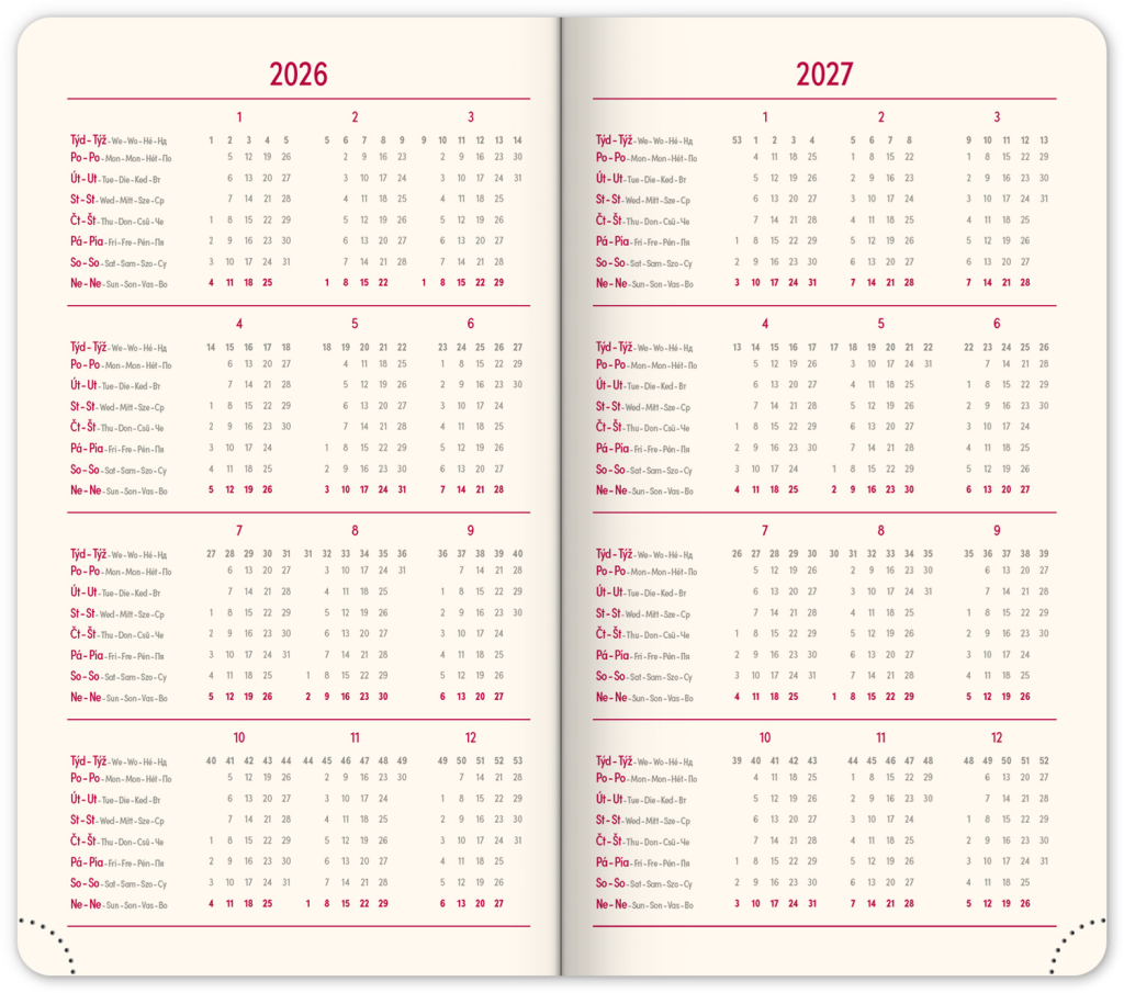 Nová řada diářů s výrazným letopočtem. Povrch má jemnou strukturu a je vhodný pro všechny typy ražeb. Týdenní rozložení s česko-slovenským kalendáriem a doplňkovou angličtinou, němčinou, maďarštinou a ruštinou.