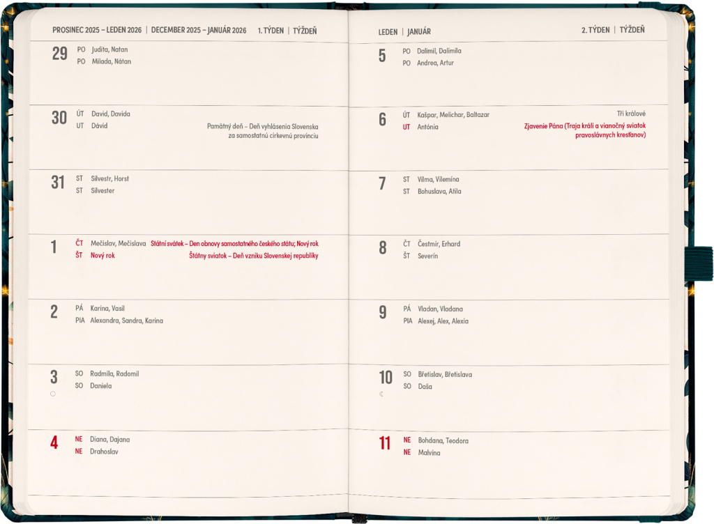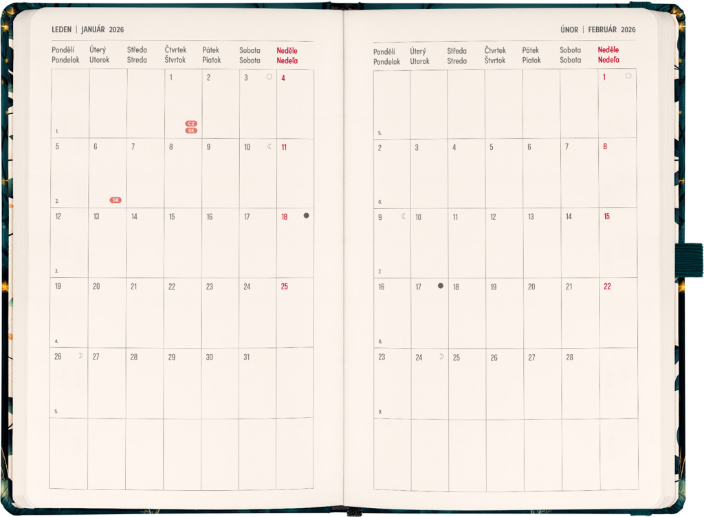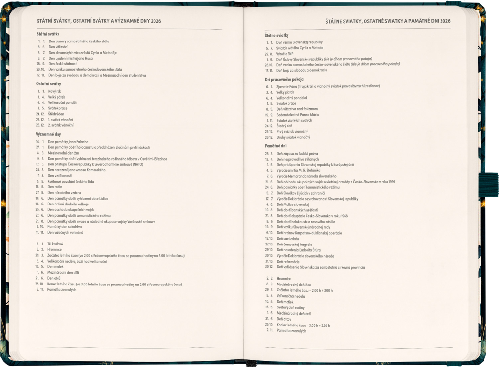DVA SVĚTY. JEDEN PRODUKT. Hledáte dokonalou kombinaci plánování a zapisování poznámek? PLANBOOK vám přináší to nejlepší z obou světů! Perfektní spojení diáře a zápisníku – první polovina obsahuje čtrnáctidenní horizontální kalendárium s českými a slovenskými svátky, zatímco druhá polovina nabízí linkované stránky pro vaše poznámky. Praktický, stylový a dokonale přizpůsobený vašim potřebám – ať už si plánujete den, nebo přemýšlíte nad dalším velkým projektem. PLANBOOK je ideální pro všechny, kteří milují organizaci a kreativitu na jednom místě. V