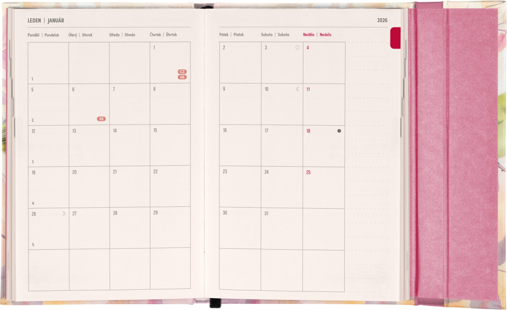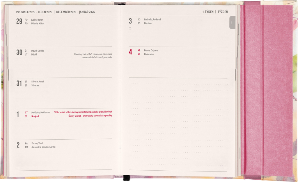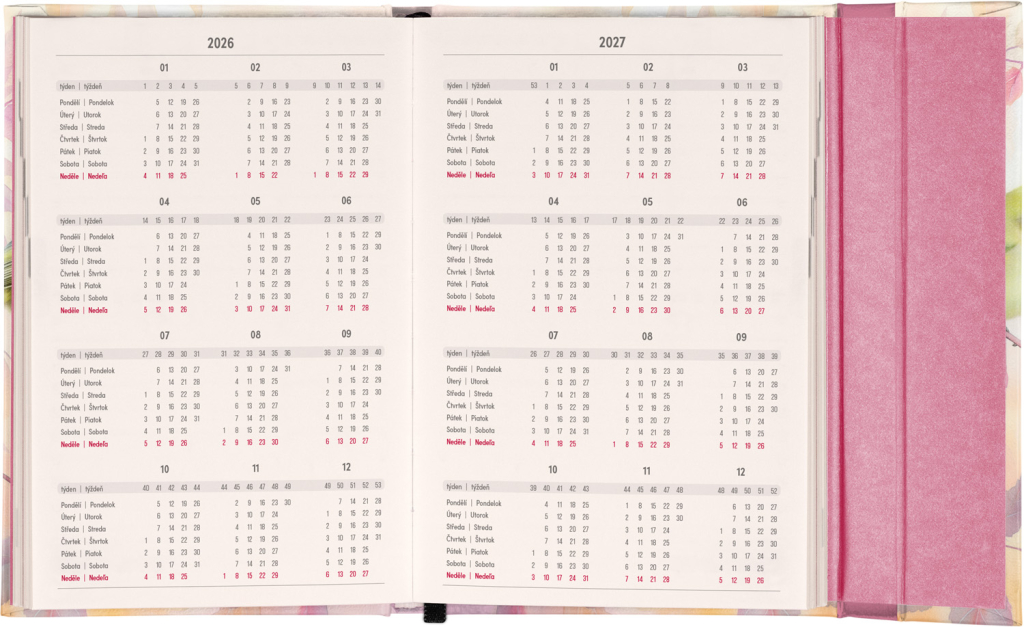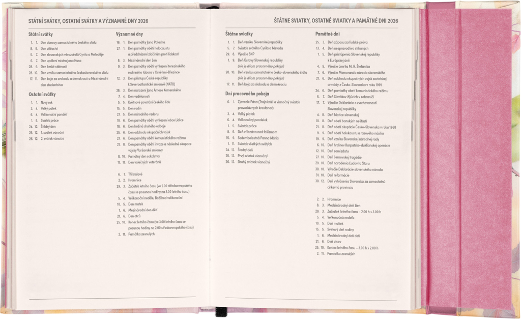 Týdenní diář s praktickým magnetickým uzavíráním je ideální volbou pro ty, kteří chtějí mít své plány přehledně pod kontrolou. Horizontální rozložení s českým a slovenským kalendáriem ve verzi týden na dvou stranách s prostorem pro poznámky. Součástí jsou praktické měsíční přehledy, ideální pro plánování dovolených či prázdnin, a také seznam českých a slovenských svátků a jmenin. V