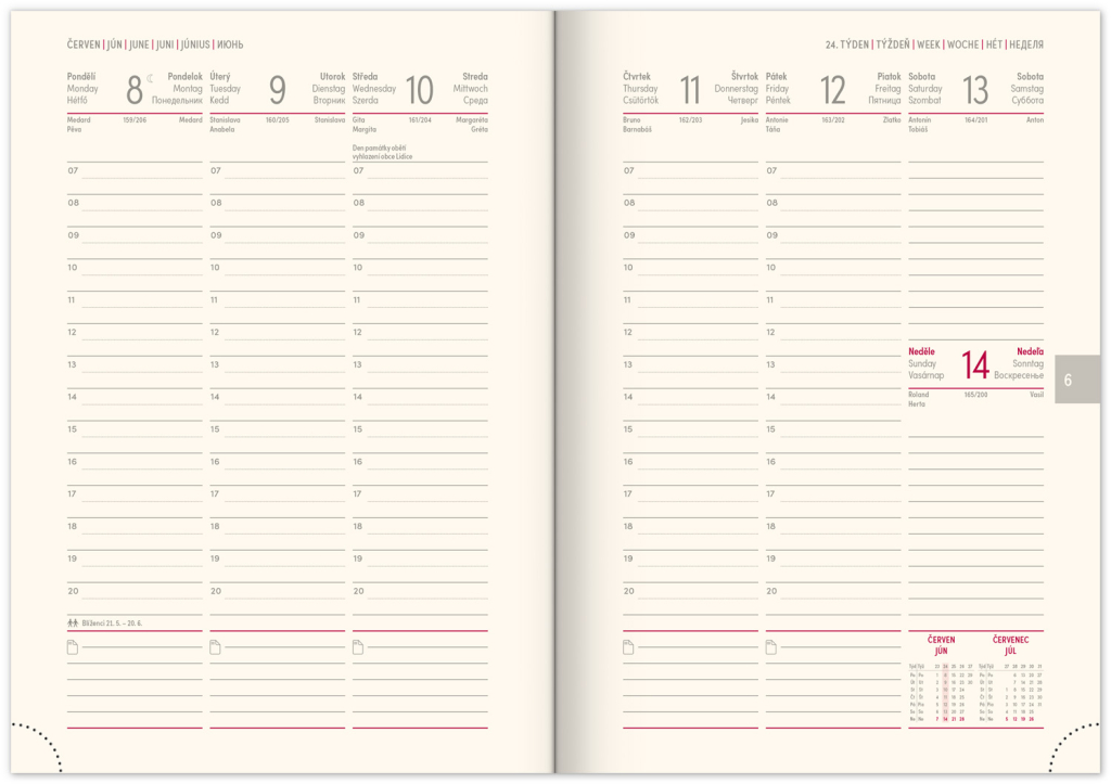 Nová řada diářů v moderním designu doplněném o pevnou gumičku a poutko na pero. Týdenní rozložení s česko-slovenským kalendáriem a doplňkovou angličtinou, němčinou, maďarštinou a ruštinou.