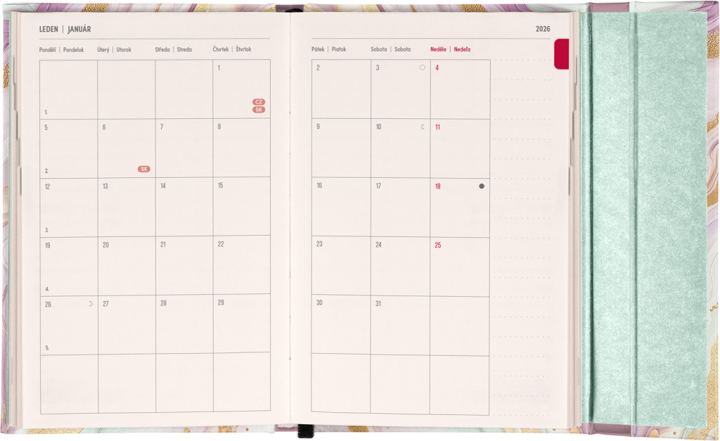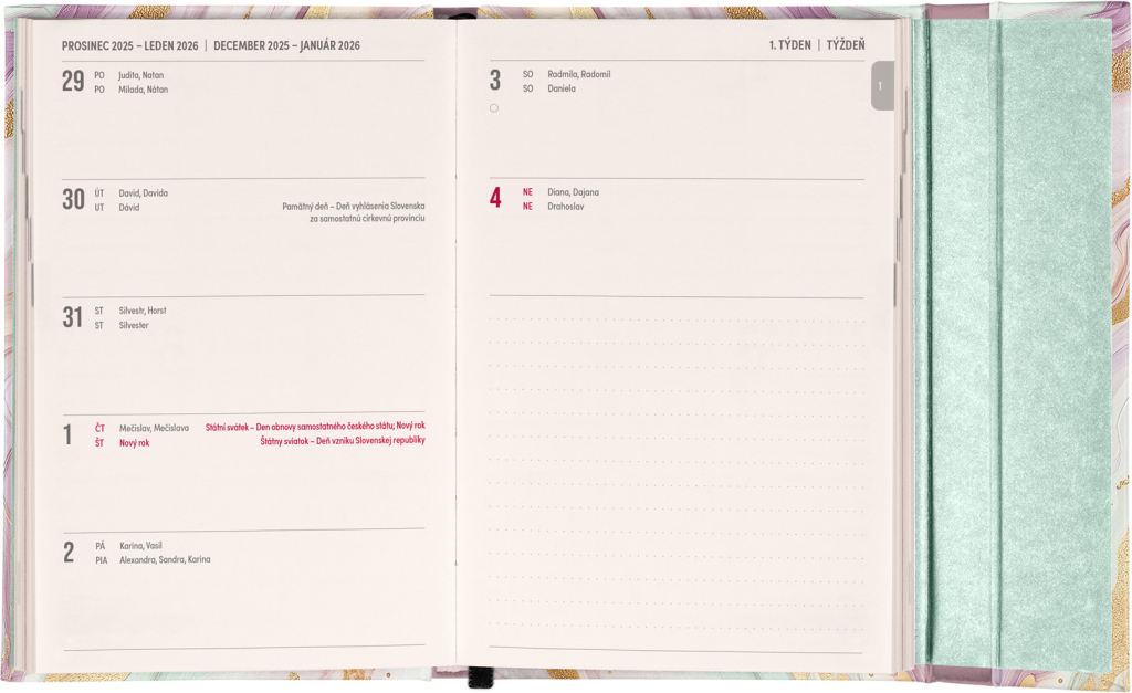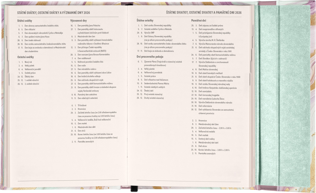 Týdenní diář s praktickým magnetickým uzavíráním je ideální volbou pro ty, kteří chtějí mít své plány přehledně pod kontrolou. Horizontální rozložení s českým a slovenským kalendáriem ve verzi týden na dvou stranách s prostorem pro poznámky. Součástí jsou praktické měsíční přehledy, ideální pro plánování dovolených či prázdnin, a také seznam českých a slovenských svátků a jmenin. V