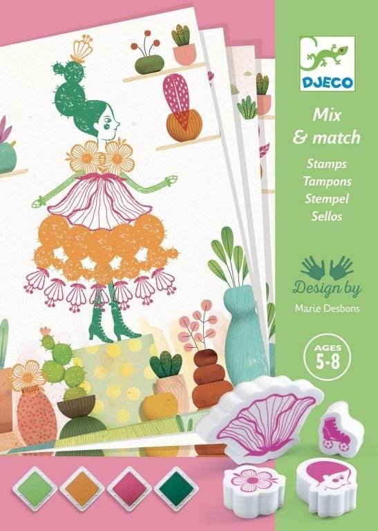 Sada razítek, která dětem umožňuje skládat si vlastní postavy kombinací tvarů a různých barev a vytvářet tak krásné květinové outfity. Postupně tisknou razítka a tisknou vzory, aby ozdobily poskytnuté scény. Děti baví vytváření kombinací a popouštění fantazie. Scény ožívají pokaždé něčím jiným! Sada obsahuje: 6 karet k vyplnění (15 x 21 cm), 14 razítek, 4 inkoustové podložky (oranžová, fuchsiová, jemně zelená, tmavě zelená), 1 brožura s barevnými vysvětlivkami krok za krokem.