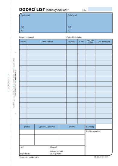 Popis produktu Dodací list - daňový doklad •tiskopis splňuje všechny platné požadavky zákona o DPH •nepropisovací •nečíslovaný •formát A5 na výšku •obsahuje 100 listů odtržitelných perforací, se zakládacím děrováním Parametry produktu Upřesnění nepropisovací ________________________________________ Formát A5