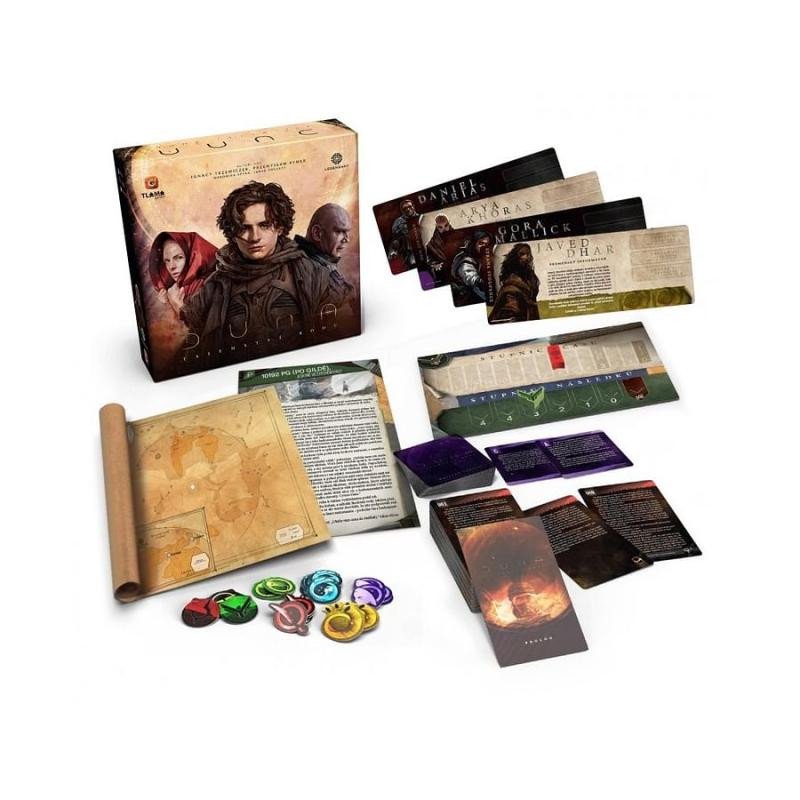 DUNA: TAJEMSTVÍ RODU je kooperativní příběhovou hrou, v níž se připojíte k hnutí odporu vzdorujícímu harkonnenské moci! Během originálního dobrodružství inspirovaného nejnovějším velkofilmem Duna bude vaším úkolem včas a s omezenými zdroji splnit sérii misí. Je nemožné projít všemi setkáními, která hra nabízí, a její příběh se bude proměňovat podle rozhodnutí a obětí, jež budete během hry muset učinit. Podaří se odhalit tajemství Arrakisu právě vám? Na konci každé ze 4 kapitol podá vaše skupina hlášení, ve kterém na základě získaných informací určíte své další kroky. Tato hlášení také rozhodnou, jakým směrem se bude celý příběh ubírat. Hra nezná vítěze ani poražené. Namísto toho čeká na hráče jedinečný příběh utvořený jejich vlastními zážitky a rozhodnutími. Přidejte se k odporu proti rodu Harkonnenů! • Hra je určena pro 1-4 hráče od 14 let. • Pravidla jsou v češtině. Herní materiál je v češtině. Hra obsahuje: • 1 balíček setkání (72 karet) • 1 balíček indicií (24 karet), • 4 úvody kapitol (označené P, I, II, III), • 1 ukazatel následků • 1 ukazatel času • 1 herní plán • 5 žetonů následků • 27 žetonů zdrojů (6 zbraní, 6 koření, 6 vody, 6 lstí, 3 moudrosti) • 1 list s nálepkami dovedností • 4 desky postav/stoupenců • 1 mapa Duny (42 x 28 cm) • 1 mapa Tel Gezeru • 1 pravidla hry