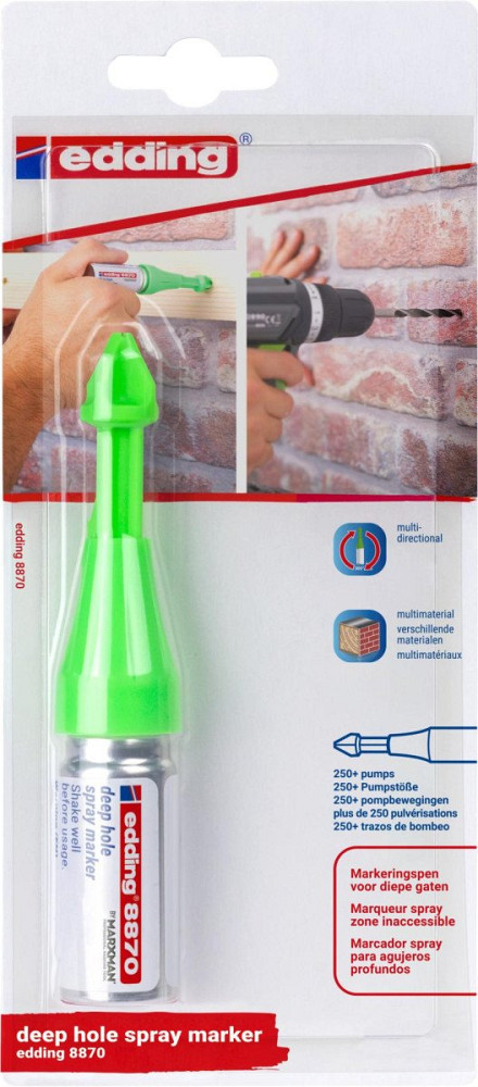 Značkovač otvorů EDDING 8870 pro precizní označení místa vrtání až do hloubky 50 mm. Neonově zelená křídová značka je otíratelná, značkovač vydrží na 250 použití. Vhodný pro označování téměř všech povrchů pod různými úhly.