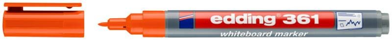Popisovač na bílé tabule edding 361 s tenkým hrotem umožní psaní tenkou stopou na všechny neporézní povrchy jako je email či melamin. Popisovač lze použít i na flipcharty. Napsaná stopa rychle zasychá, je světlostálá a je stíratelná zasucha. Inkoust neobsahuje butylacetát. Klip na víčku brání skutálení popisovače. Popisovač je znovu naplnitelný (náhradní inkoust edding BTK 25 a BT 30) a jeho kulaté hroty jsou vyměnitelné. Prodloužením životnosti popisovače pomůžete snížit množství komunálního odpadu. Kulatý hrot. Šíře stopy: 1 mm. Vyrobeno v Německu.