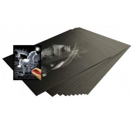 Fólie Essdee Scraperboard jsou desky potažené fólií přetištěné černým inkoustem. Nástroj ostré škrabky vyryje čáru povrchovým inkoustem, aby odhalil třpytivé efekty pod ním. Gravírování je stejně snadné jako kreslení tužkou a při stejné akci. Deska poskytuje extrémní kontrast s hustou černou a jasnou fólií. Vytvářejte oslňující obrazové efekty ve „stříbře“. Ideální pro všechny druhy školních projektů a skvělý jako koníček pro děti. K dispozici v obyčejných černých listech.