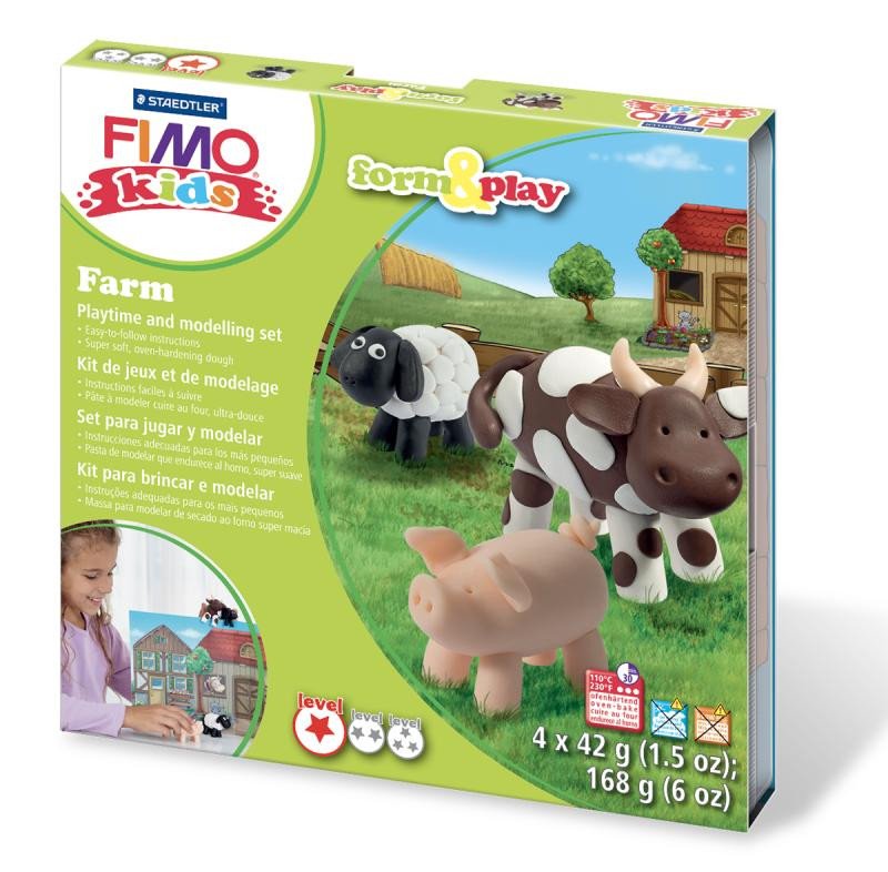 Se sadami FIMO kids "form & play" mohou děti vytvářet různé tematické světy podle detailních a dětem srozumitelných pokynů a vytvořit si tak svůj vlastní příběh ve světě her, který si vlastnoručně vyrobily. Bez ohledu na množství zkušeností s modelováním, které děti mají, si každé může vybrat svou úroveň obtížnosti (1=snadné, 2=středně obtížné, 3=obtížné) a dostane detailní, srozumitelný návod jak postupovat krok za krokem s množstvím obrázků. Obrázky odpovídají obtížnosti dané sady. Každá sada obsahuje čtyři balení FIMO Kids, pozadí, které se hodí k danému tématu, modelovací nástroj a brožurku s návodem. Tyto sady jsou mezi dětmi nejoblíběnější ze všech produktů z řady FIMO kids a jsou velmi vhodné jako dárek. Balení obsahuje: 4x FIMO kids v odstínech odpovídajících obrázku na krabičce, modelovací nástroj, kreslené pozadí, návod krok za krokem. FIMO kids je modelovací hmota, která se vytvrzuje pečením v troubě a která byla vyvinuta speciálně pro dětské ruce. Široký výběr produktů uspokojí všechny potřeby a úrovně obtížnosti. FIMO kids podporuje v dětech kreativitu a představivost tím, že jim umožňuje vytvářet si svoje vlastní hračky podle své fantazie. Vlastnosti produktu: Hmota je měkká, snadno tvarovatelná a dětem se s ní lehce a dobře pracuje. Není třeba ji předem zpracovávat, dá se použít rovnou z balíčku. Balena ve znovu uzavíratelných sáčcích, nespotřebované zbytky hmoty se tak dají snadno uchovávat a chránit před nečistotami až do dalšího použití. Široká paleta jasných barev, které můžete mezi sebou míchat a vytvářet tak nové odstíny. Obsahuje 8 praktických prolisů, které vam usnadní míchání nových odstínů. Bez zápachu. Vytvrzuje se pečením v troubě po dobu 30 minut při 110 C°, připraveno k hraní jakmile vychladne. Zlepšuje jemnou motoriku a představivost. Bezpečnost: FIMO kids má CE certifikát. FIMO kids splňuje směrnice EU o bezpečnosti hraček. Vypékat pod dozorem dospělé osoby. Po vyjmutí z trouby nechat vychladnout.