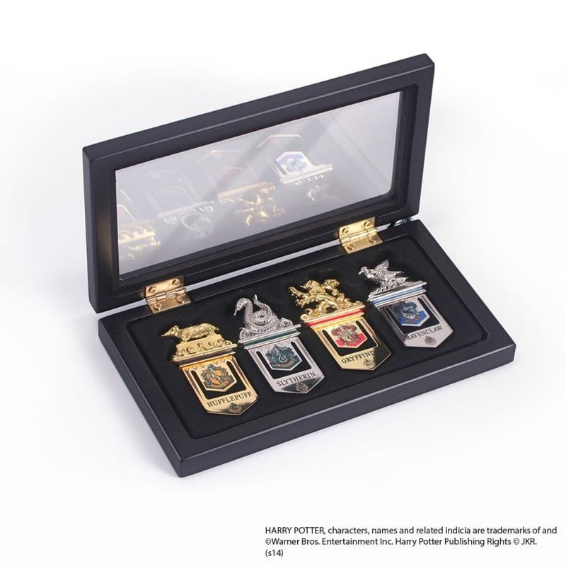 Set 4 záložek s erby a maskoty bradavických kolejí ve sběratelské krabičce. Rozměry: 16 x 9 cm