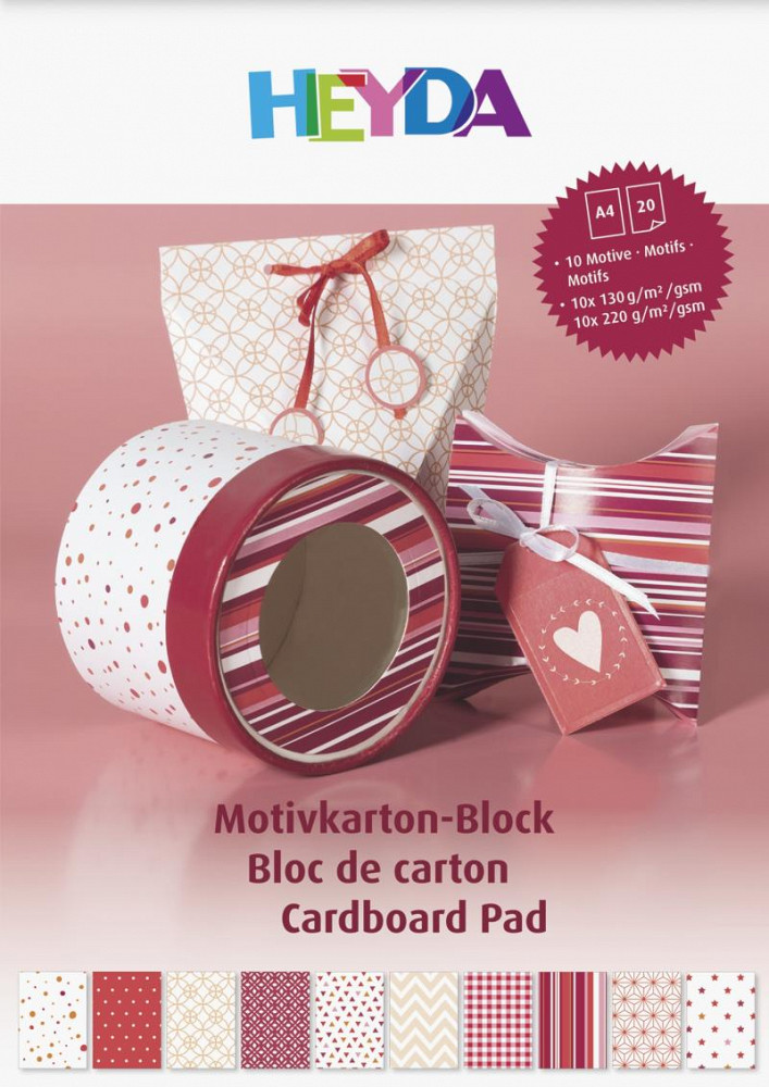 Blok barevných papírů, 10 motivů ve 2 gramážích, převážně oboustranně potištěny. Gramáže papírů 100 a 220 g/m2