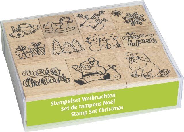 Sada 11 ks dřevěných razítek s vánočními motivy. Díky hluboké gumové textuře lze razítka použít na papír, textil, polymery i jiné povrchy. Jsou vhodná pro všechny druhy inkoustů. Po skončení práce jednoduše opláchněte teplou vodou.
