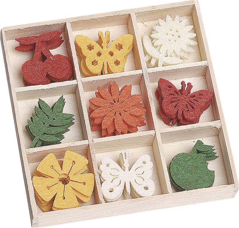 Filcové ozdoby v praktickém boxu, 9 motivů po 5 ks. Rozměr jednoho motivu cca 3cm x 3cm. Ideální pro zdobení přáníček, dárků, krabiček apod.