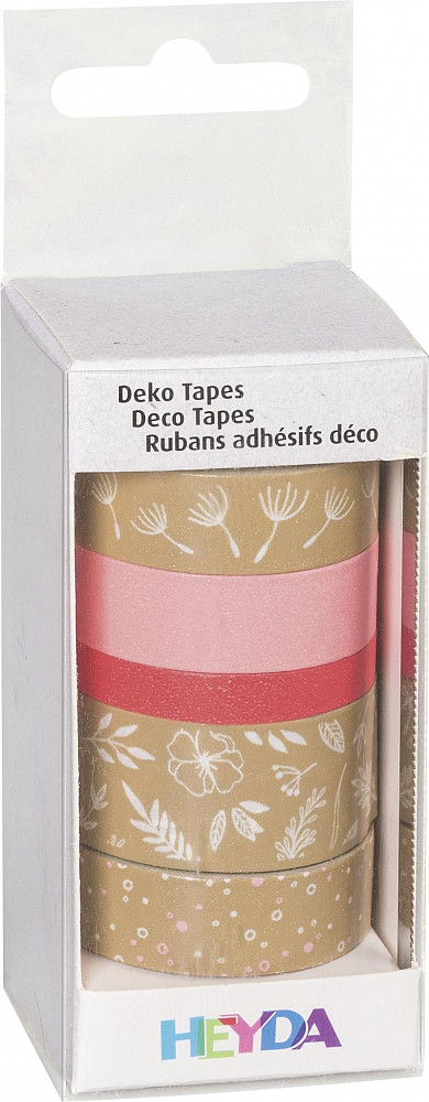 Sada 5ti kusů ozdobných lepicích pásek v přírodním stylu. Oproti obyčejné lepicí pásce se lehce odlepují a nenechají po sobě žádnou stopu po lepidle. Jde s nimi například vyzdobit fotoalbum, diář, deník, přání nebo je využít prakticky třeba jako štítky na sklenice, rozdělovače klíčů, k balení dárků, přilepení fotky na zeď atd. 3 role 1,2 cm x 5 m, 1 role 0,6 cm x 5 m, 1 role 1,8 cm x 5 m.