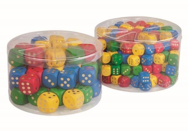 Dřevěné kostky různých barev o velikosti 25 x 25 x 25 mm slouží nejen ke klasické stolní hře. Pouze celá dóza (34 ks). Rozměry balení 10 x 14 x 10 cm. Vhodné pro děti od 1 roku.