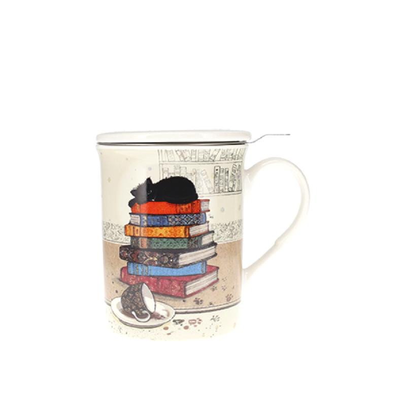 Hrnek 370 ml s pokličkou a sítkem - Kočka na knihách (BUG ART KIUB)