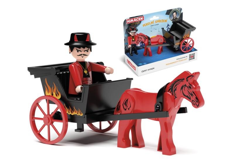 Figurka Igráčka Čerta Hynka s ohnivým kočárem taženým koníkem Uhlíkem. Inovativní propojení fyzické hračky s podcastovou pohádkou Pekelné spřežení načtenou hercem Martinem Stránským rozvíjí fantazii a jemnou motoriku dětí. Vyrobeno v ČR.