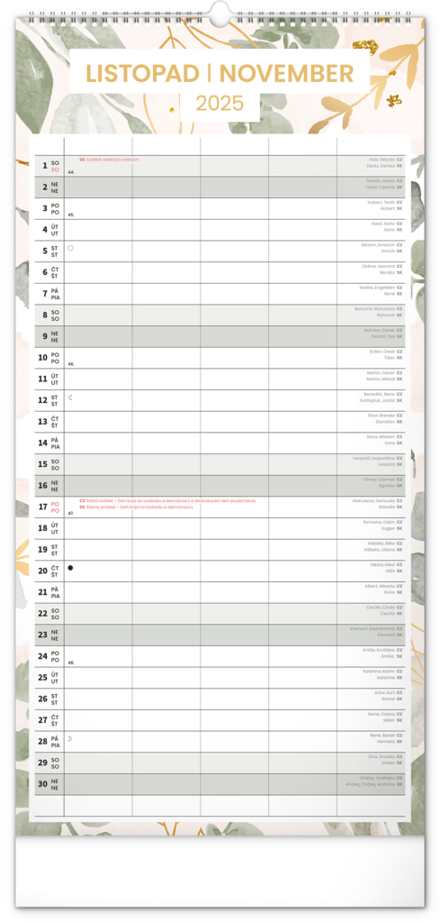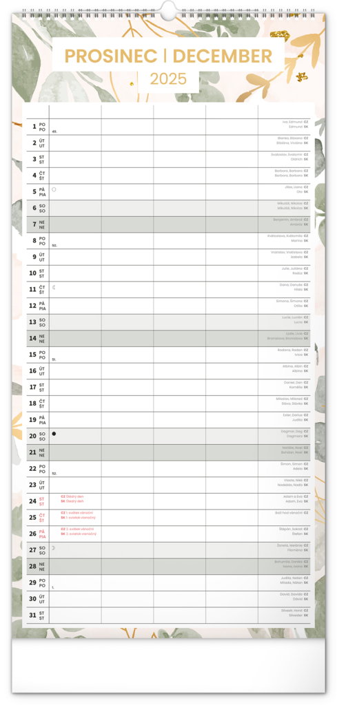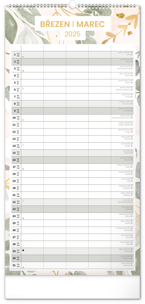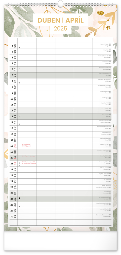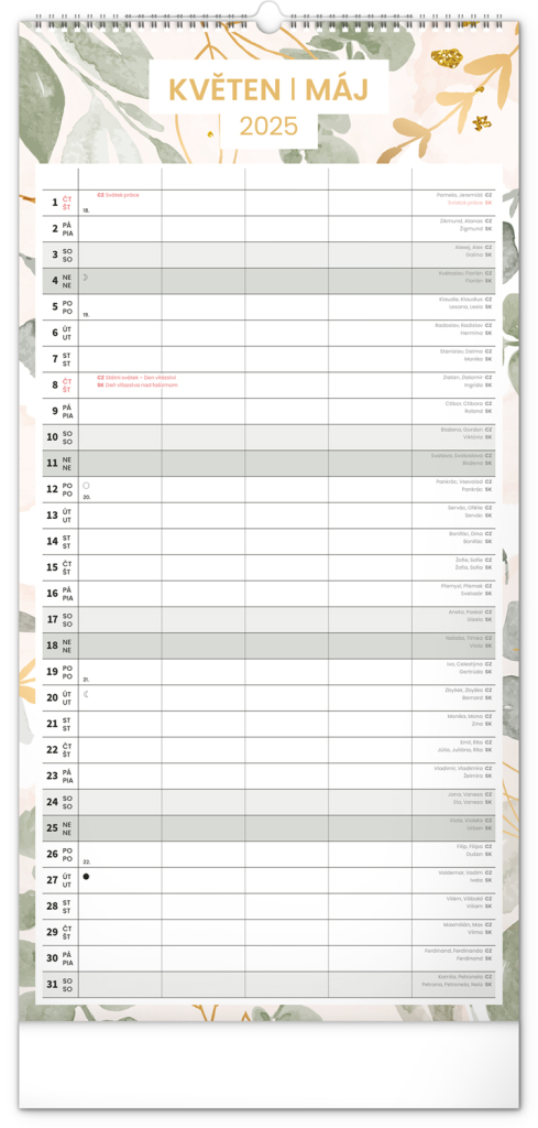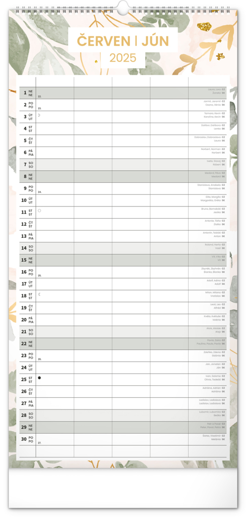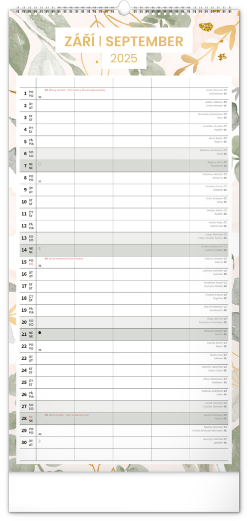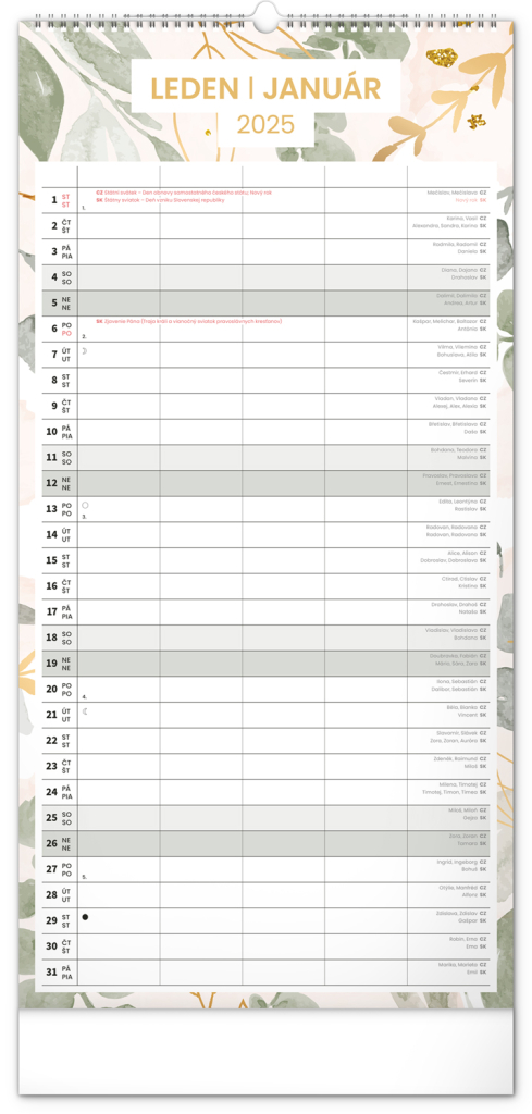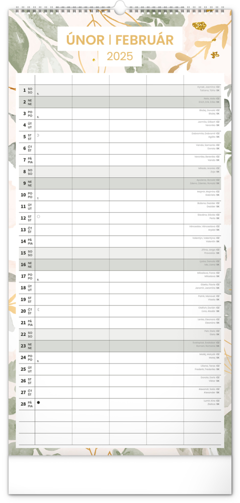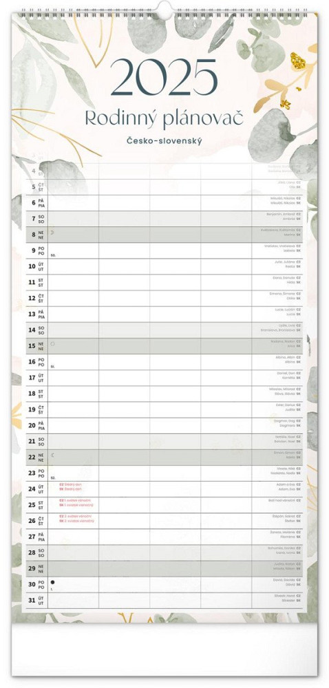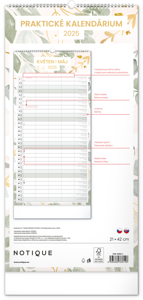 NOTIQUE Nástěnný Rodinný plánovací kalendář Květy 2025, 21 x 42 cm