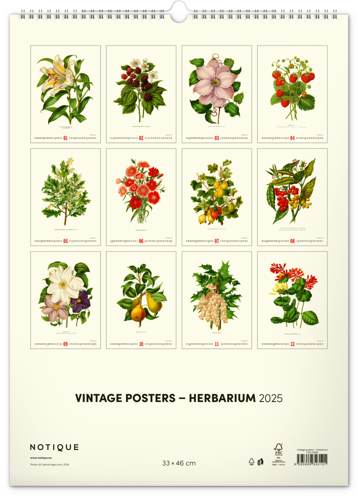 NOTIQUE Nástěnný kalendář Vintage plakáty – herbář 2025, 33 x 46 cm