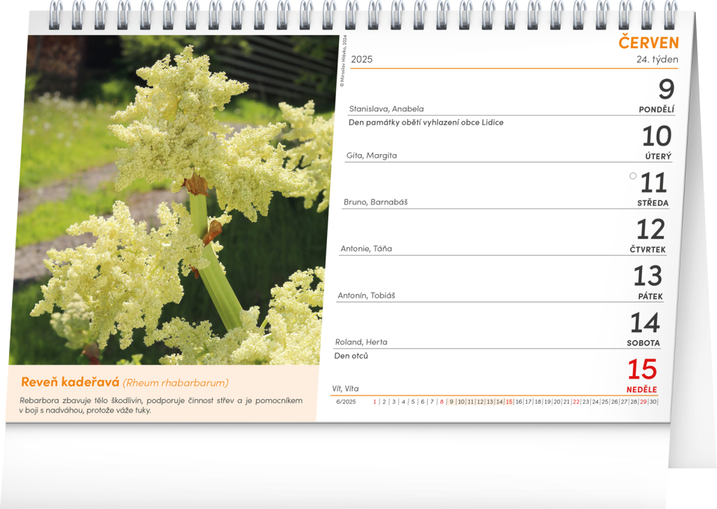 Na stránkách stolního kalendáře najdete výběr nejrozmanitějších bylinek, koření a dalších rostlin. Dozvíte se zde spoustu informací i o rostlinách, o kterých jste ani netušili, že mají léčivé vlastnosti. Kalendárium obsahuje také svátky, památné dny, fáze měsíce a přehled na celý rok 2025 a 2026.