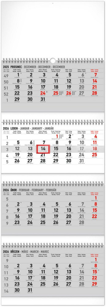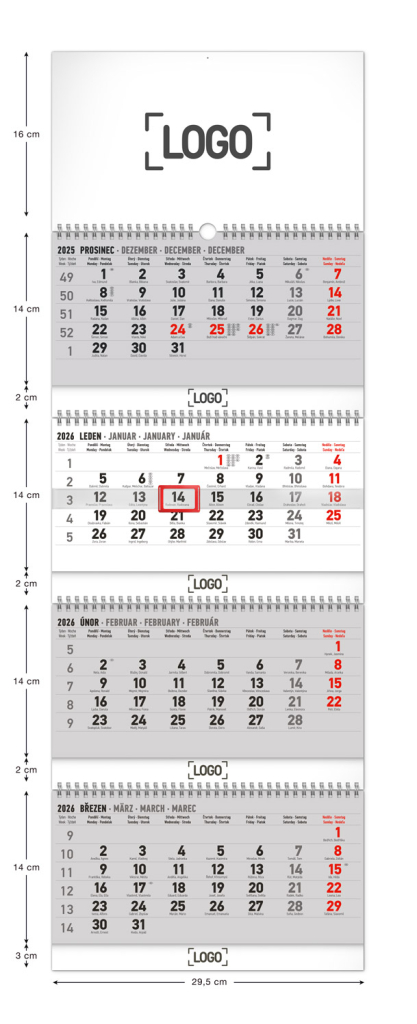 Praktický čtyřměsíční kalendář s plochou pro potisk a náhledem čtyř měsíců současně můžete díky dvojité spirále pohodlně složit do obálky velikosti A4. Kalendárium obsahuje česká jména a světové svátky. Díky volné ploše pro potisk se může stát zcela originálním předmětem pro firmy.