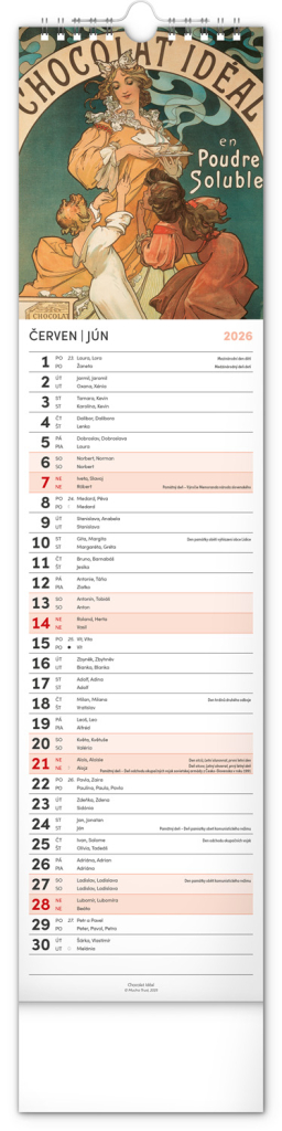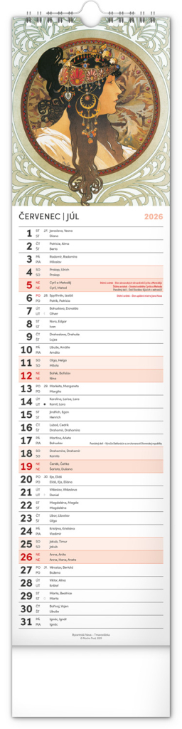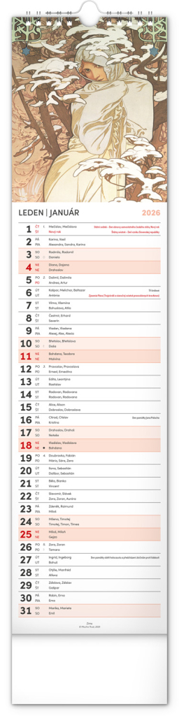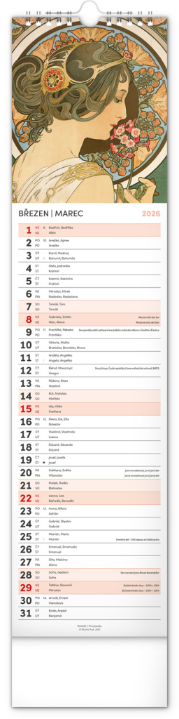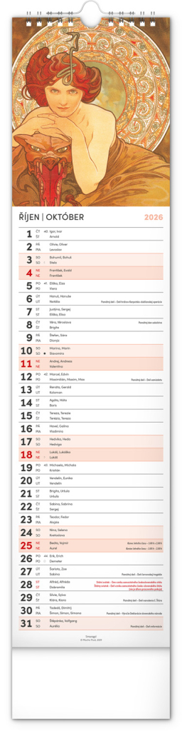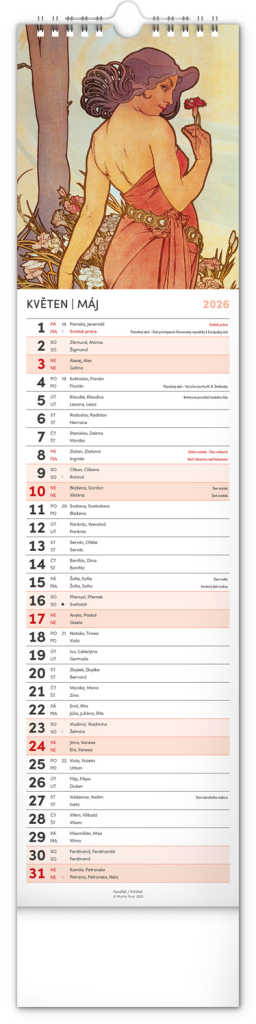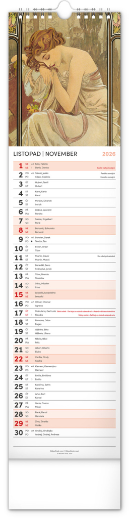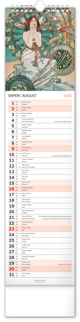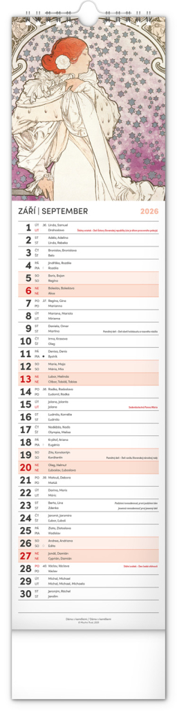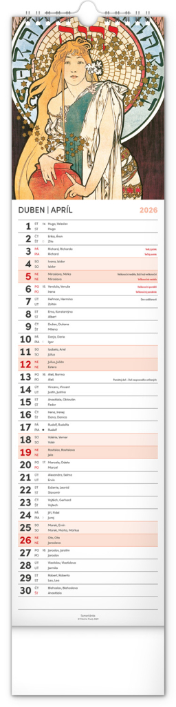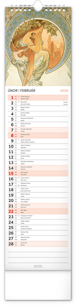 Česko-slovenský nástěnný kalendář v kravatovém formátu s reprodukcemi obrazů oblíbeného secesního malíře českého původu.