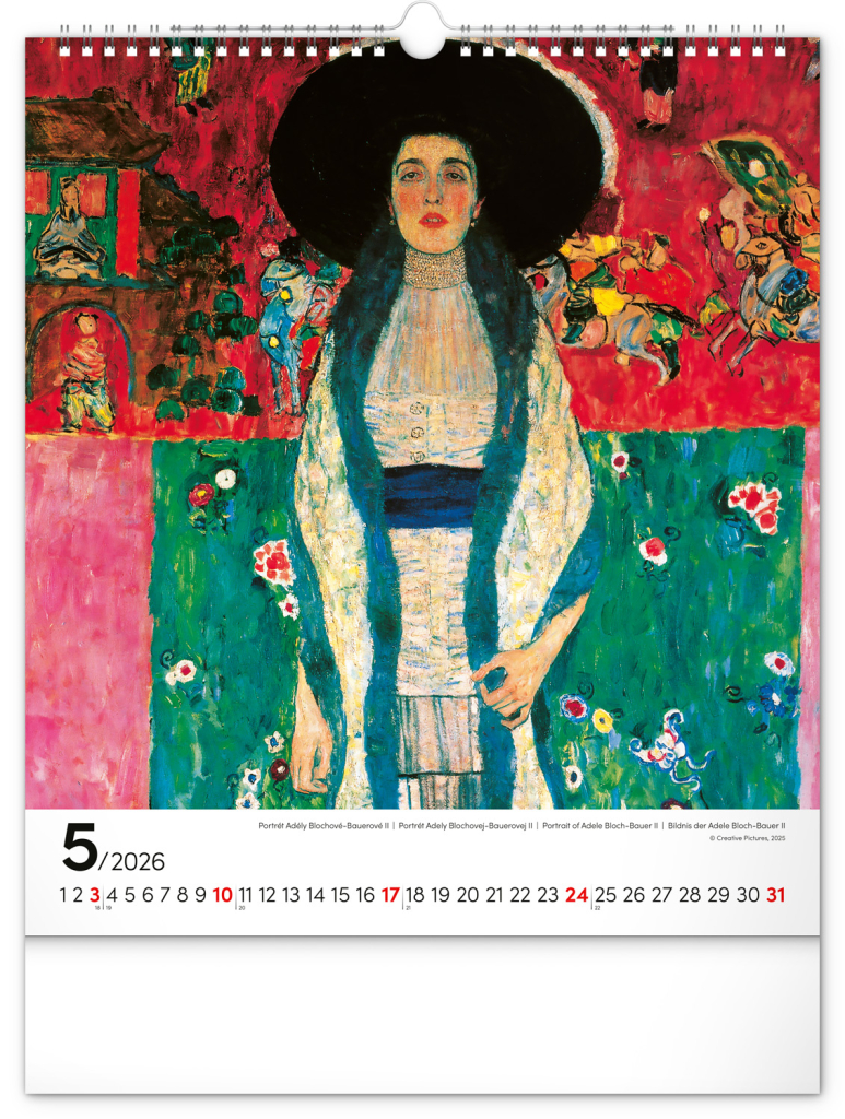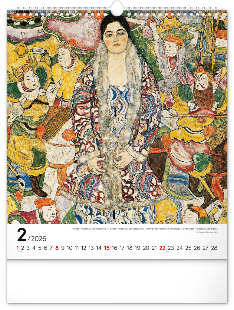 Na stranách kalendáře v obdélníkovém formátu naleznete Klimtovy obrazy žen vytištěné na kvalitním papíře s vysokou gramáží. Kalendář obsahuje univerzální kalendárium a popisky ve čtyřech jazycích.
