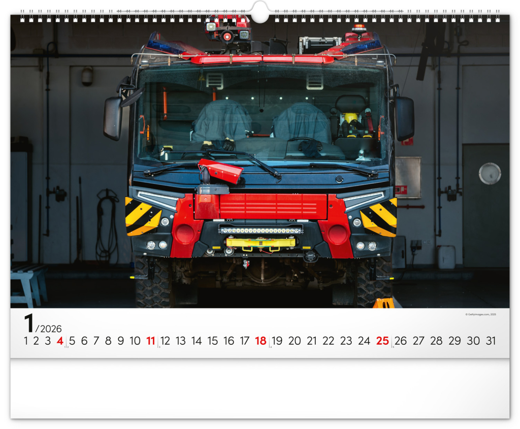 Nástěnný kalendář pro všechny příznivce hasičských vozů. Dvanáct snímků techniky hasičského záchranného sboru na stránkách kalendáře v šířkovém formátu. Fotografie jsou doplněny univerzálním kalendáriem na černém pozadí.