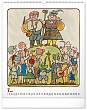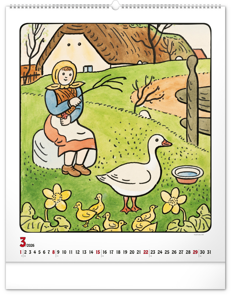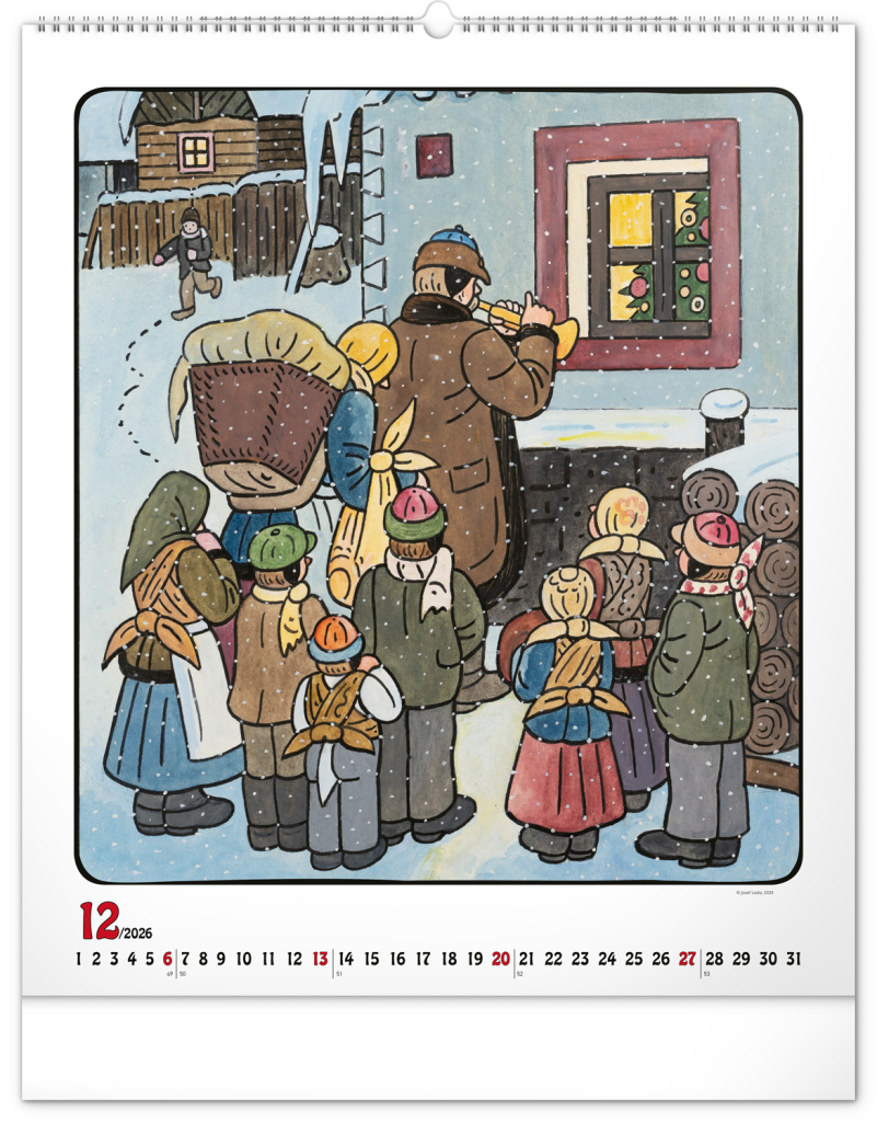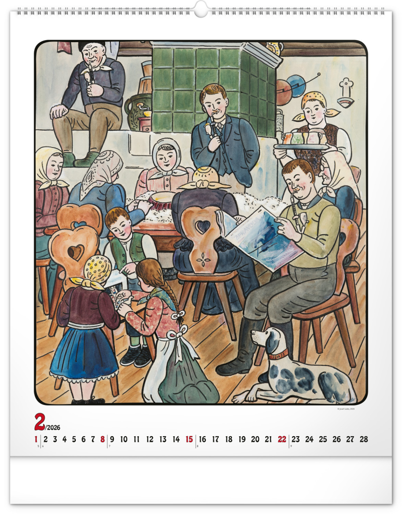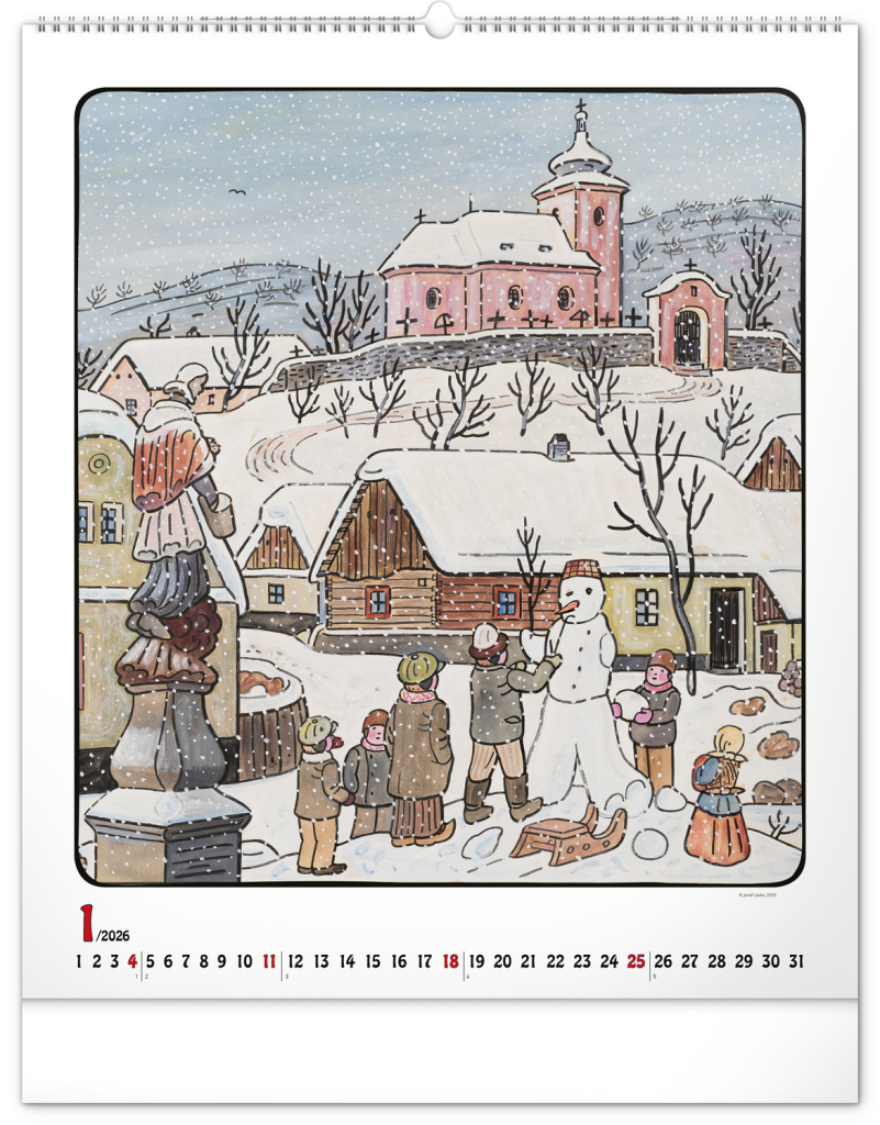 Velkoformátový kalendář s dvanácti ilustracemi Josefa Lady a jednoduchým univerzálním kalendáriem na bílém pozadí.