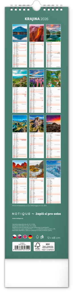 Udělejte si radost pohledem na fotografie malebné krajiny v praktickém úzkém formátu česko-slovenského nástěnného kalendáře. Kalendář obsahuje česká a slovenská jména, svátky, památné dny i měsíční fáze. V každém jednotlivém dni je prostor pro poznámky.