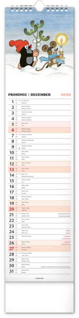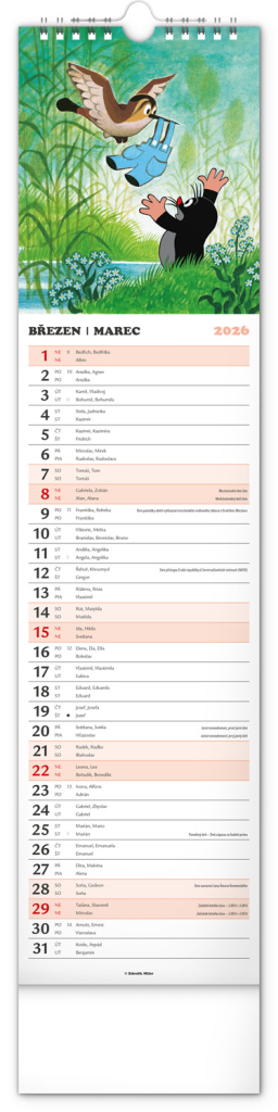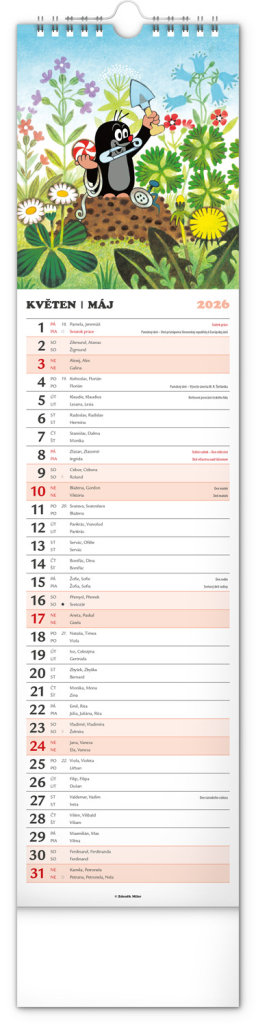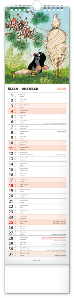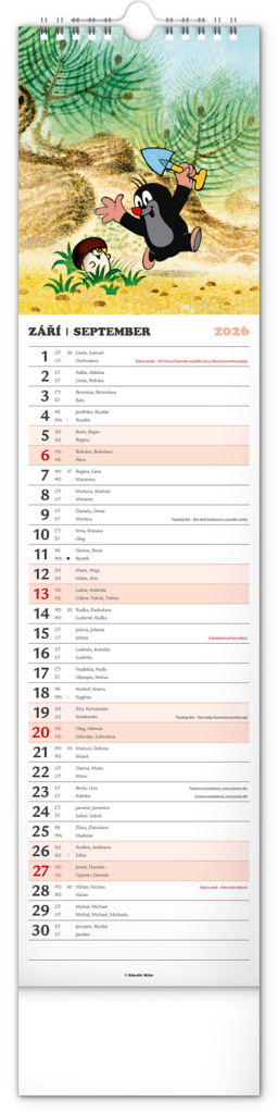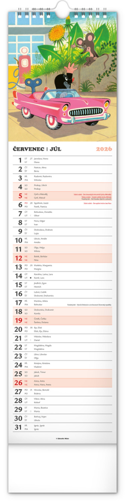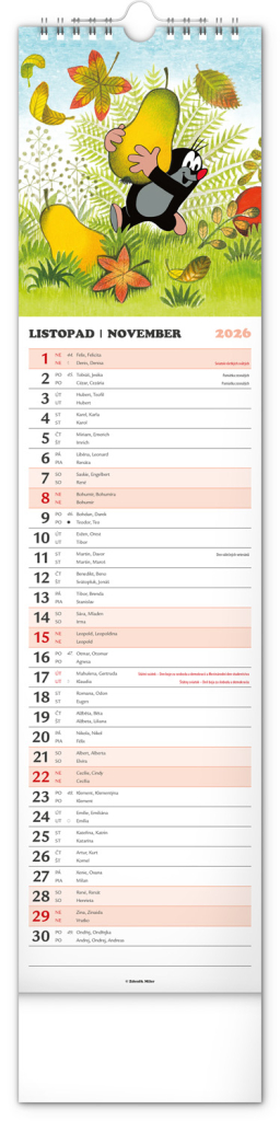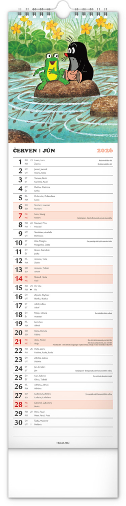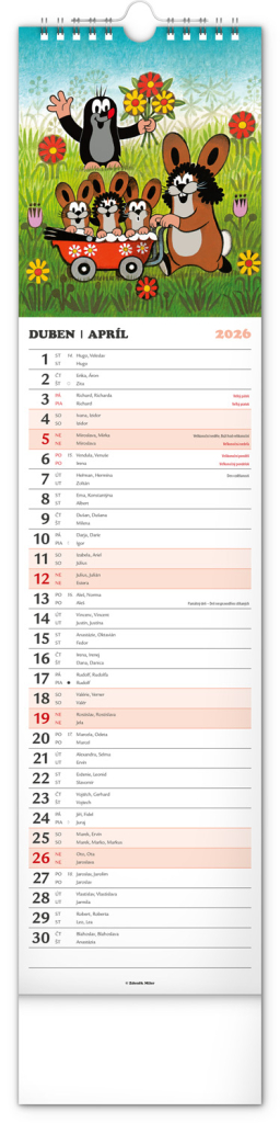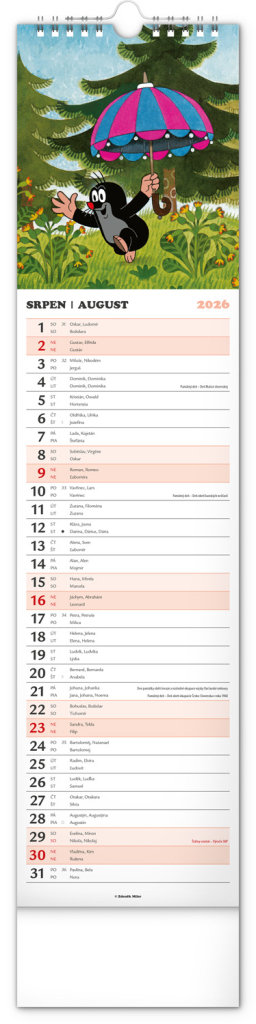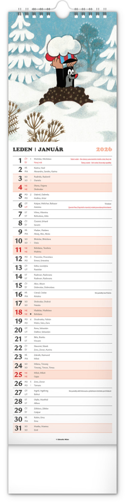 Praktický kravatový formát kalendáře s ilustracemi Zdeňka Milera. Ilustrace v kalendáři doplňuje české a slovenské kalendárium se jmény, svátky, památnými dny a fázemi měsíce. Každý den má prostor pro poznámky, víkendové dny jsou barevně odlišené od pracovních.