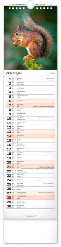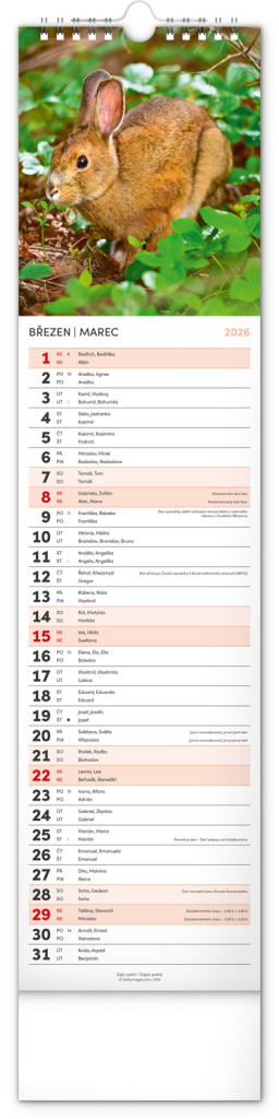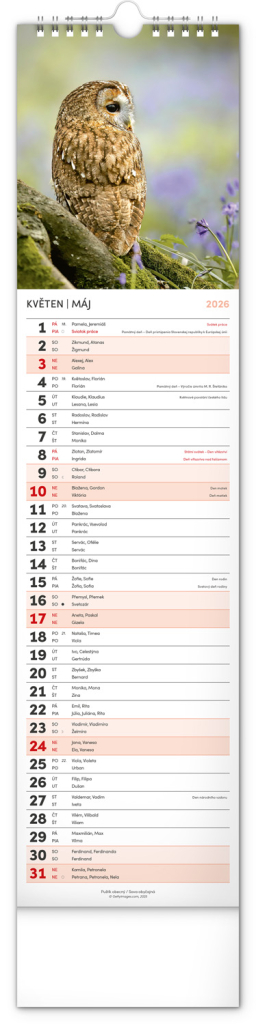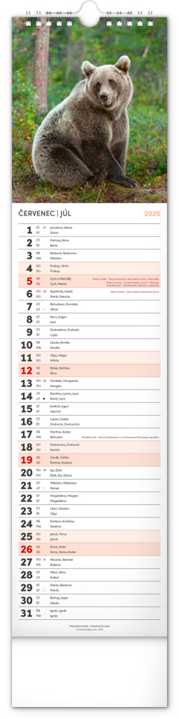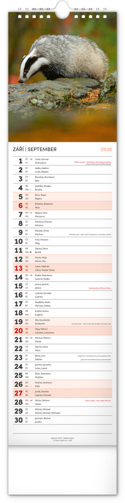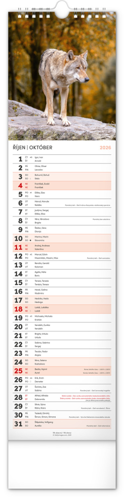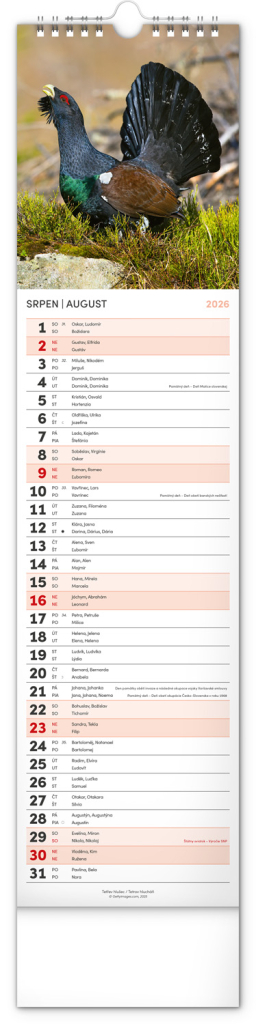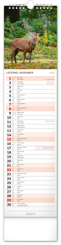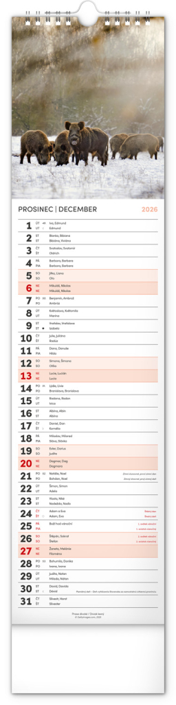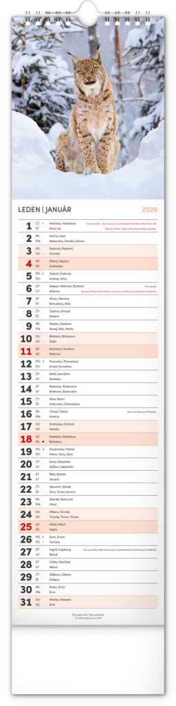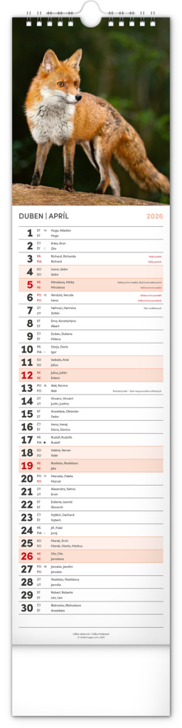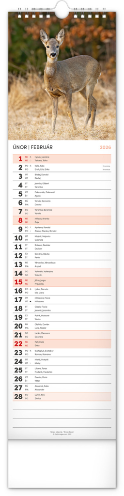 Pro milovníky přírody a lesních zákoutí – tento podlouhlý a zároveň praktický kalendář vás vezme mezi jeleny, lišky a šumící stromy. Česko-slovenský nástěnný kalendář obsahuje dvanáct snímků zvířat z našich lesů. Je dvojjazyčný a najdete v něm jak česká, tak slovenská jména, svátky, památné dny i měsíční fáze. V každém jednotlivém dni je prostor pro poznámky.