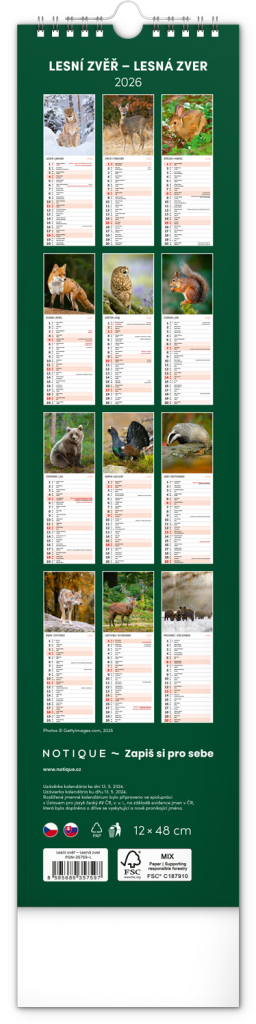 Kalendář 2026 nástěnný: Lesní zvěř - Lesná zver, 12 x 48 cm
