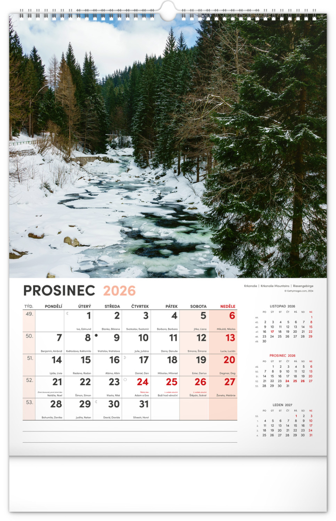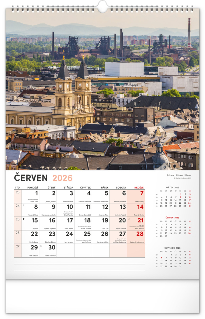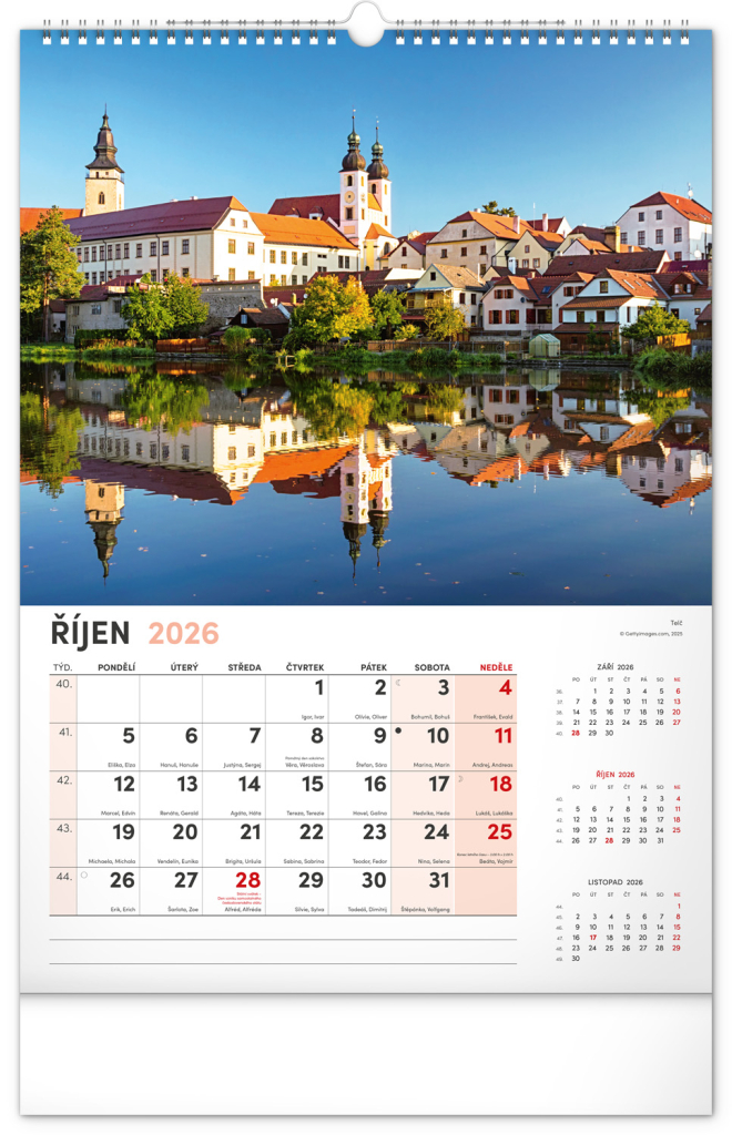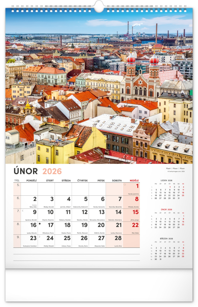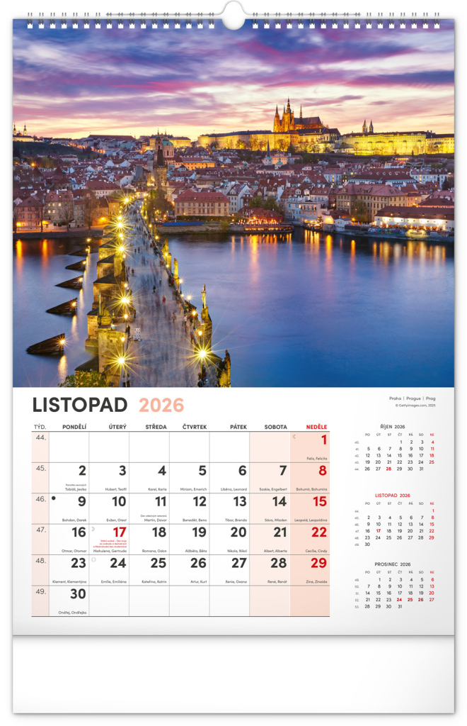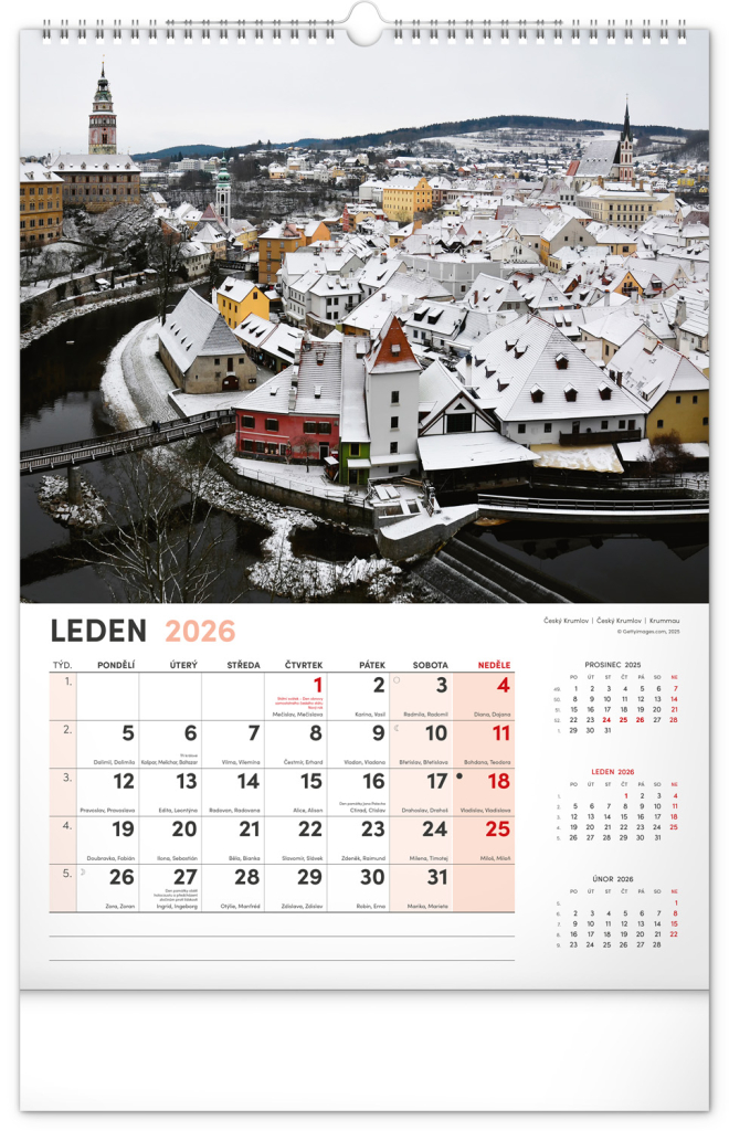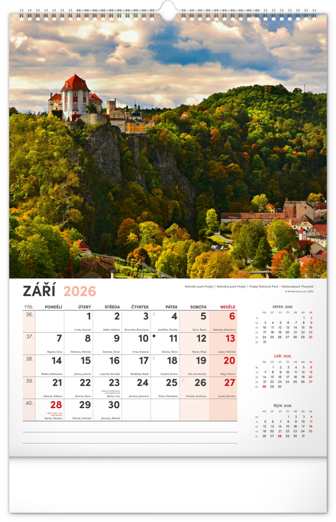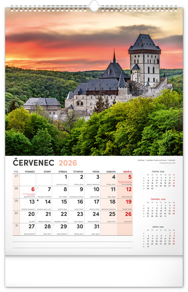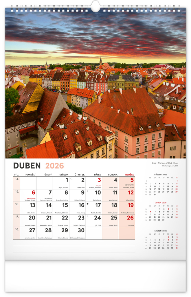Kalendář s fotografiemi z nejkrásnějších míst České republiky. Praha, Kutná Hora, Olomouc a další skvosty v kalendáři s tématem Má vlast ve výškovém formátu s popisky a jednoduchým kalendáriem.