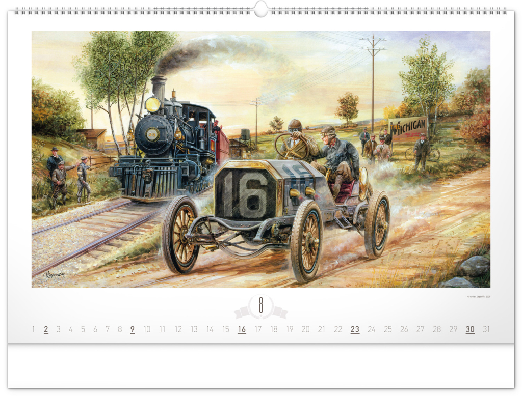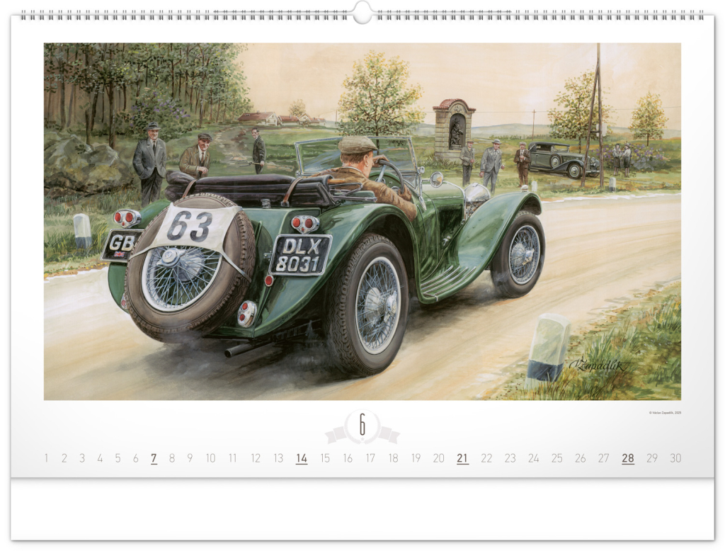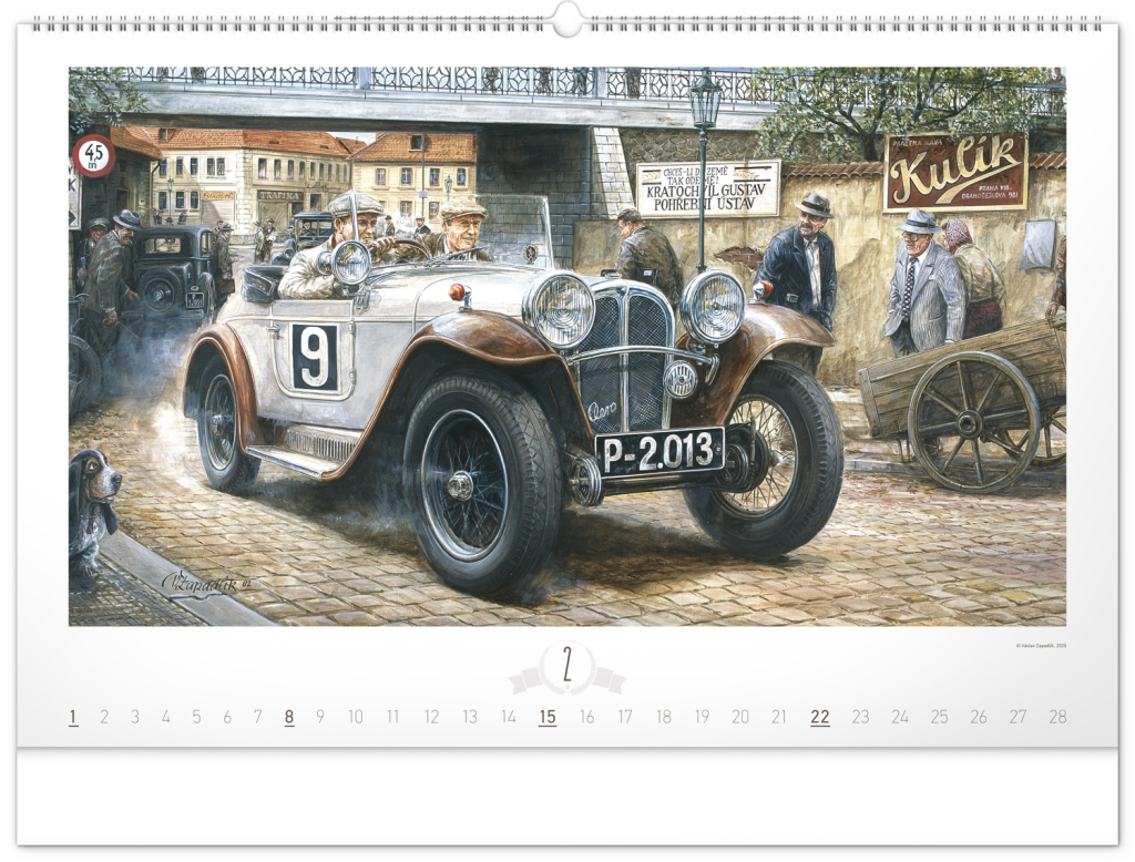 Krása starých sportovních automobilů a neopakovatelné závodní atmosféry od české ilustrátorské legendy Václava Zapadlíka. Nástěnný kalendář v šířkovém formátu je doplněn univerzálním kalendáriem se zvýrazněnými nedělemi.