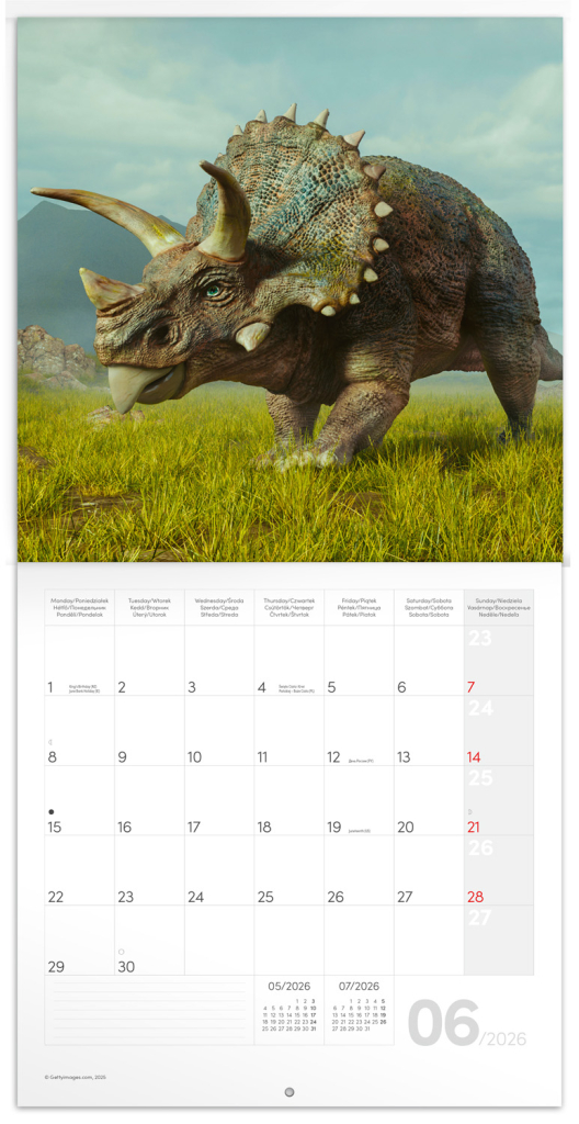 Poznámkový kalendář s věrnými ilustracemi pravěkých dinosaurů a šestijazyčným kalendáriem uzpůsobeným pro vaše plány a poznámky. V
