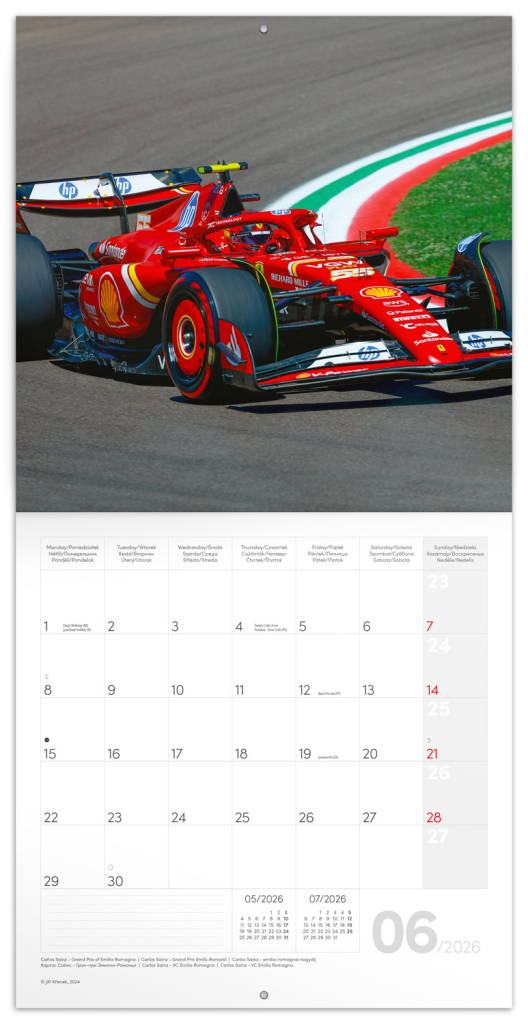 Atraktivní fotografie z prostředí adrenalinového světa Formule 1, zachycené objektivem Jiřího Křenka. V kalendáři kromě fotek najdete přehledné kalendárium od září 2025 do prosince 2026 v šesti jazycích, měsíční fáze, důležité svátky a prostor pro poznámky na každý den. V