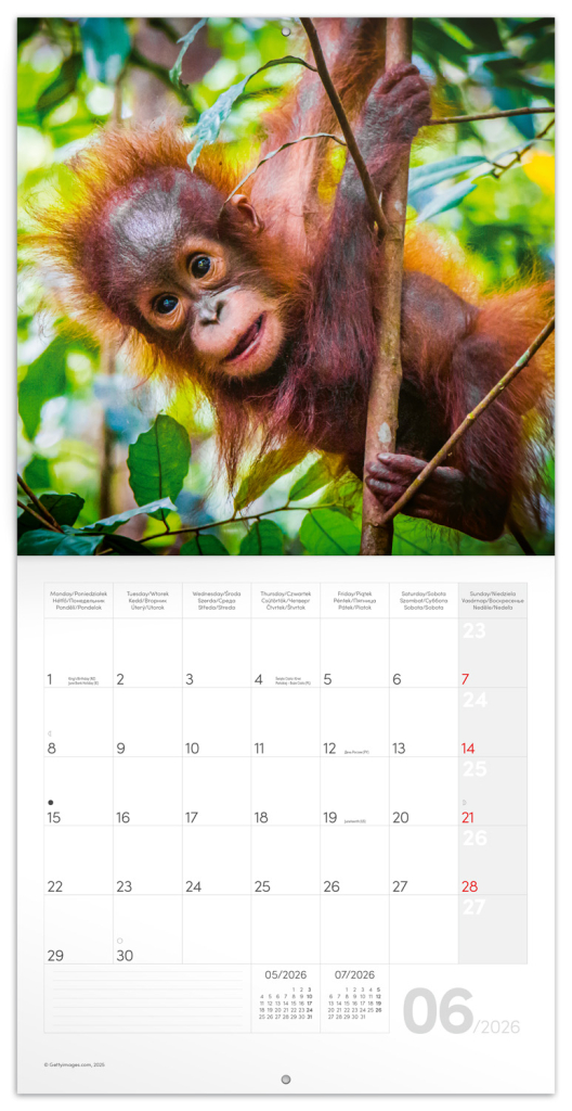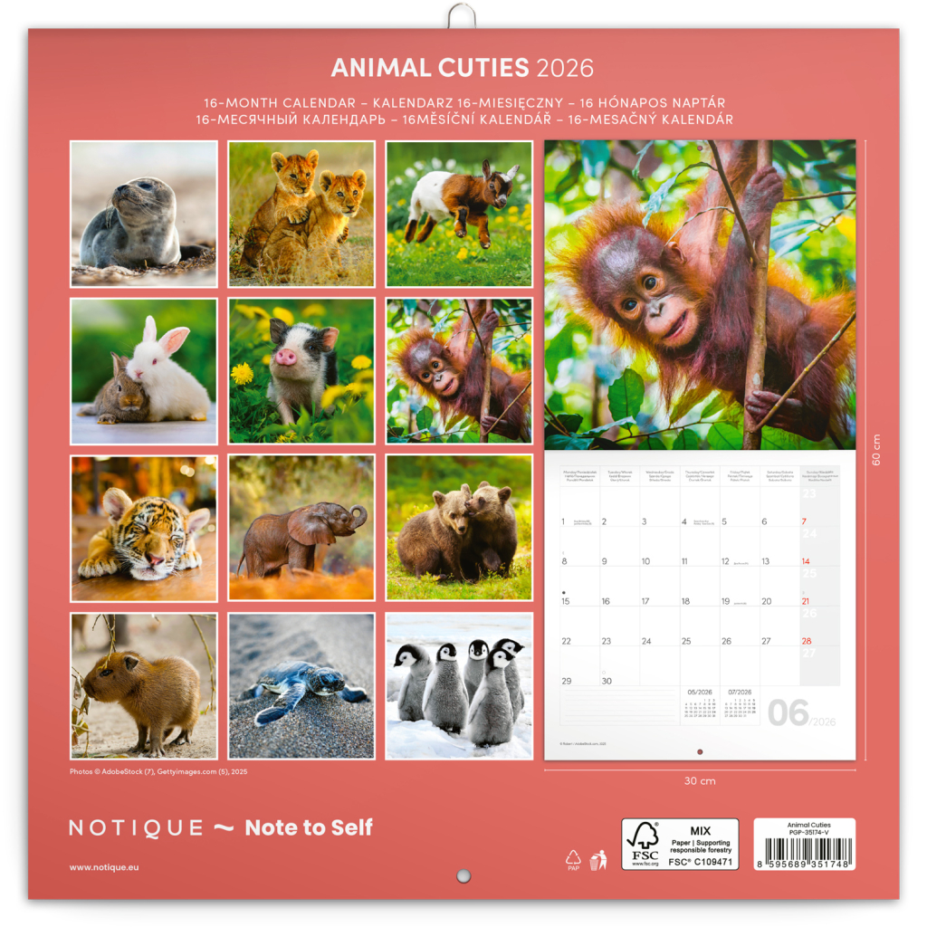 Fotografie roztomilých prasátek, opiček nebo lachtanů vám budou dělat radost celý rok. V kalendáři kromě fotek najdete přehledné kalendárium od září 2025 do prosince 2026 v šesti jazycích, měsíční fáze, důležité svátky a prostor pro poznámky na každý den. V