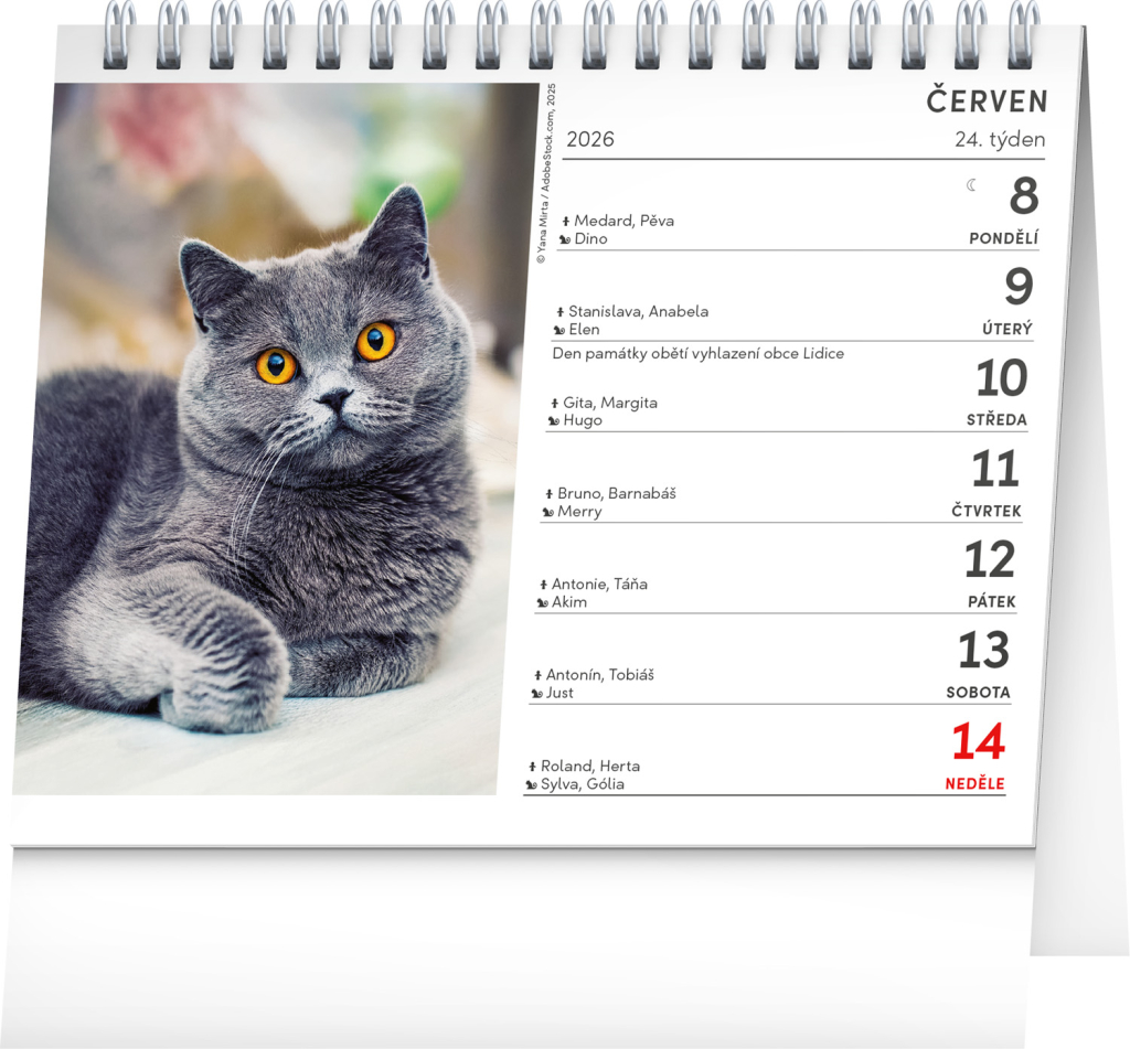 Kalendář 2026 stolní: Kočky - se jmény koček, 16,5 x 13 cm
