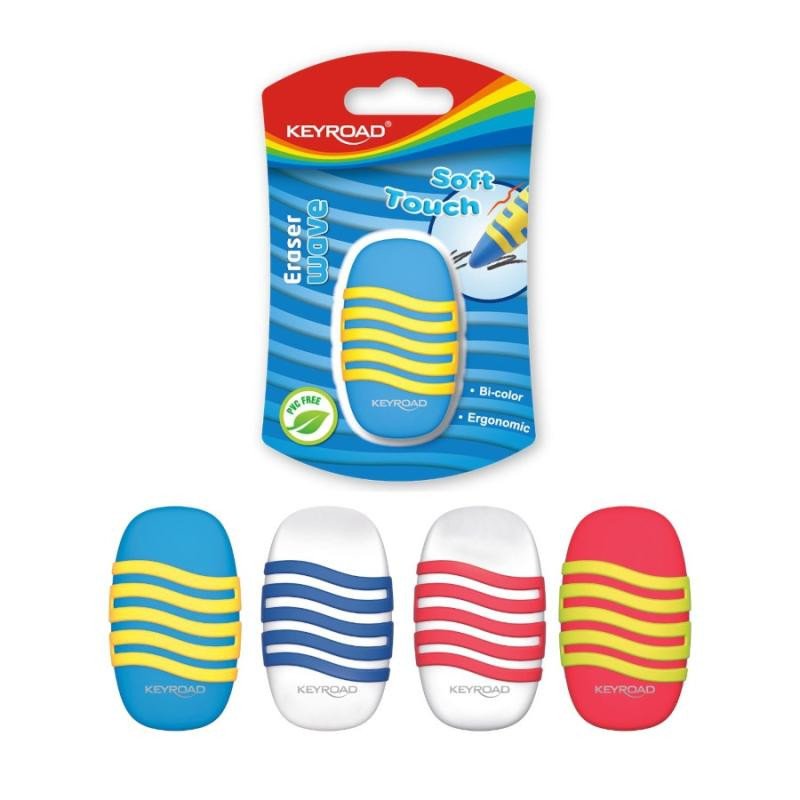 Dvoubarevná pryž s designem vlnek. Ergonomický tvar s měkkým úchopem. Tvar umožňující přesné oboustranné použití. Perfektní výsledek gumování. Dodáváno v mixu 4 barevných provedení. Dodáváno na blistru. Rozměr každé pryže 5,8 x 3,4 x 1 cm.