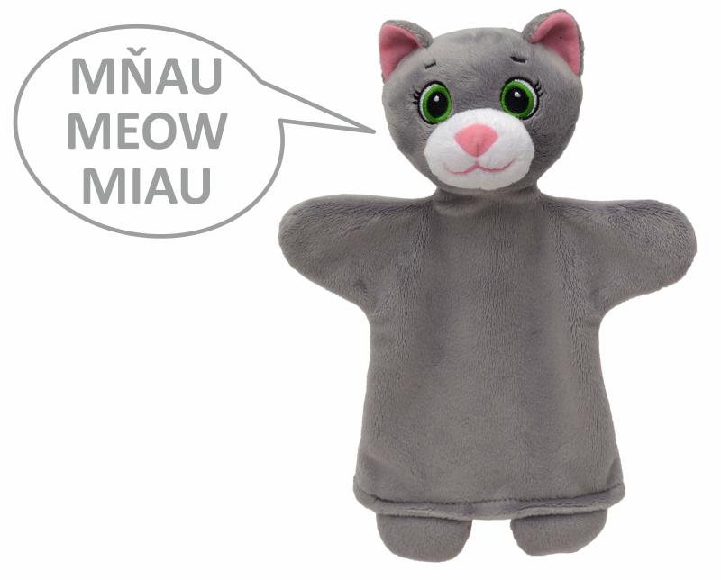 Textilní maňásek po zmáčknutí bříška mňouká jako kočička. Pratelný bez zvukového modulu. Vyměnitelné baterie 3xLR44 jsou součástí. Cena vč. PHE.Doporučený věk: od 1 roku, CE