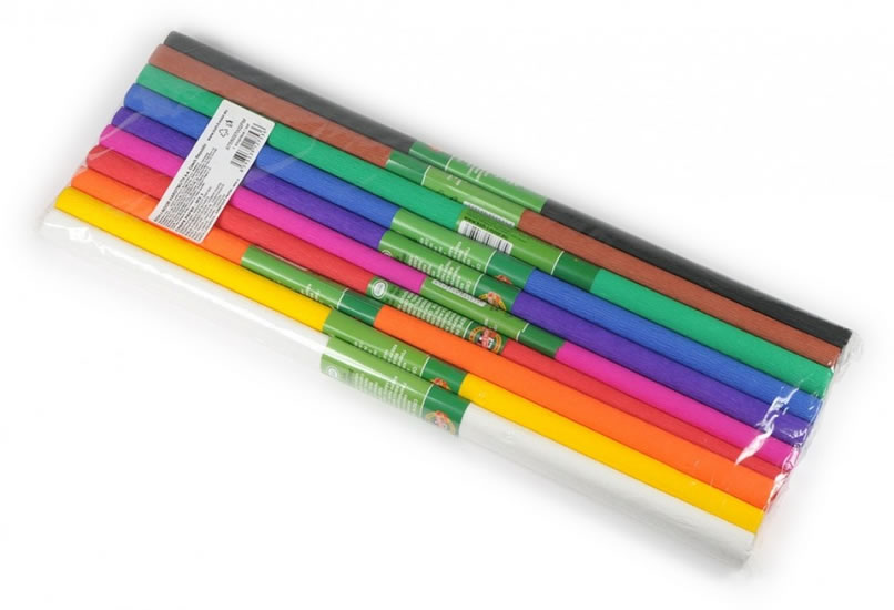 Výrobek se používá jako krepový papír pro školní, výtvarné a aranžérské práce. Souprava krepového papíru 10 ks v následujících barvách: vínová, červená, tmavě oranžová, světle oranžová, tmavě žlutá, světle zelená, zelená, tyrkysová, modrá, tmavě fialová. Jednotný krepový papír o rozměru 2000 x 500 mm je složen do balíčku o rozměrech cca 500 x 35 x 18 mm. 10 kusů krepového papíru je vloženo do folie. Stupeň krepování 30-40 %.